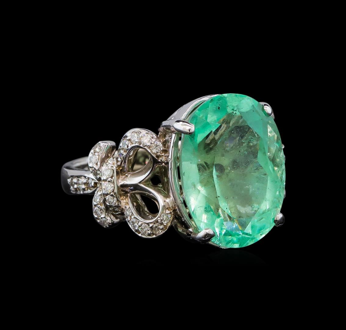 One electronically tested 14KT white gold lady's cast fashion ring with a split shank bow motif with a bright polish finish. The featured lady's ring has a shank measuring 2.67 millimeters wide. Identified with markings of 'K14'. Condition is new, good workmanship. Containing: One prong set oval modified brilliant cut natural emerald, measuring 15.25 x 11.09 x 8.50mm, (depth est.) 9%. bulge factor, approximate weight of 8.92ct., clarity is moderately included, medium light, moderately strong, green color, (GIA G 4/4), cut is good. Transmitting light somewhat diffusely, transparent to translucent. Naturally occurring internal & external characteristics are present. Indications of oil residue. Colored gemstones are presumed to have been subjected to commonly used enhancement processes. Graded loose prior to setting in the GIA Laboratory, Report #5172664653. Forty-Eight prong set round brilliant cut diamonds, measuring 1.25 - 1.15 x 0.72mm (depth est.) approximate total weight of 48 Stones = 0.30ct. Graded in the setting. Clarity SI-2 to I-2. Color: H - I Cut Good. Total Weight of Colored Stones 8.92ct.. Total Weight of Diamonds 0.30ct.. Total Weight of Ring 8.70gm. GAS Appraised at $14,005.00.