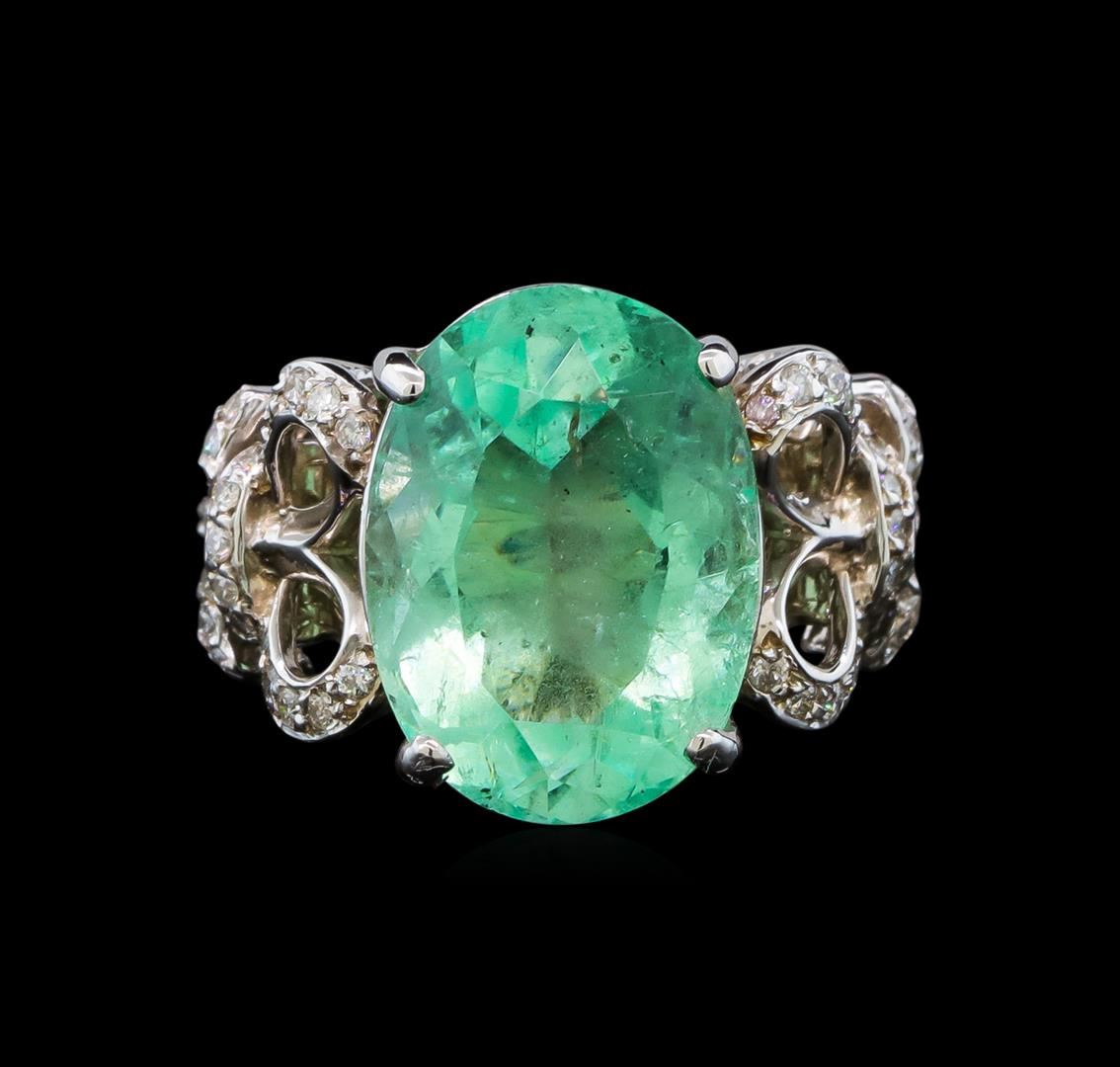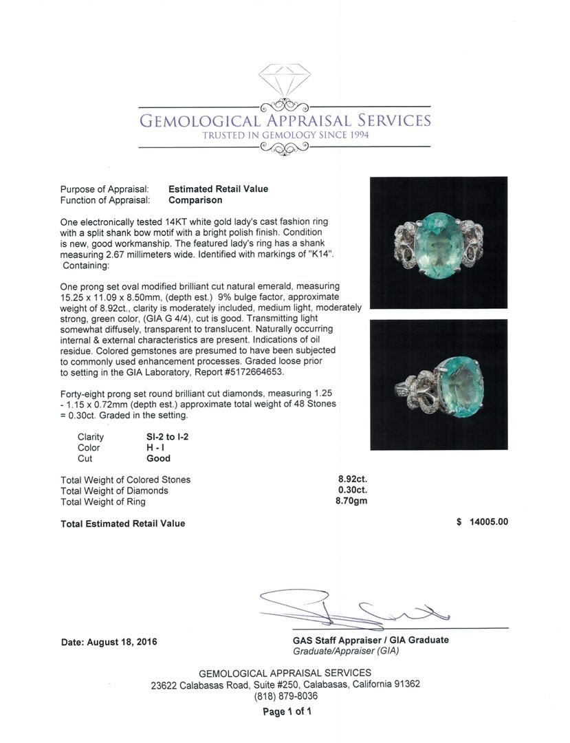 One electronically tested 14KT white gold lady's cast fashion ring with a split shank bow motif with a bright polish finish. The featured lady's ring has a shank measuring 2.67 millimeters wide. Identified with markings of 'K14'. Condition is new, good workmanship. Containing: One prong set oval modified brilliant cut natural emerald, measuring 15.25 x 11.09 x 8.50mm, (depth est.) 9%. bulge factor, approximate weight of 8.92ct., clarity is moderately included, medium light, moderately strong, green color, (GIA G 4/4), cut is good. Transmitting light somewhat diffusely, transparent to translucent. Naturally occurring internal & external characteristics are present. Indications of oil residue. Colored gemstones are presumed to have been subjected to commonly used enhancement processes. Graded loose prior to setting in the GIA Laboratory, Report #5172664653. Forty-Eight prong set round brilliant cut diamonds, measuring 1.25 - 1.15 x 0.72mm (depth est.) approximate total weight of 48 Stones = 0.30ct. Graded in the setting. Clarity SI-2 to I-2. Color: H - I Cut Good. Total Weight of Colored Stones 8.92ct.. Total Weight of Diamonds 0.30ct.. Total Weight of Ring 8.70gm. GAS Appraised at $14,005.00.