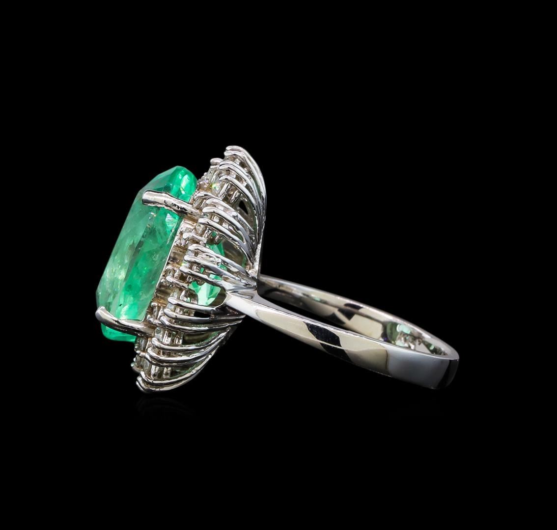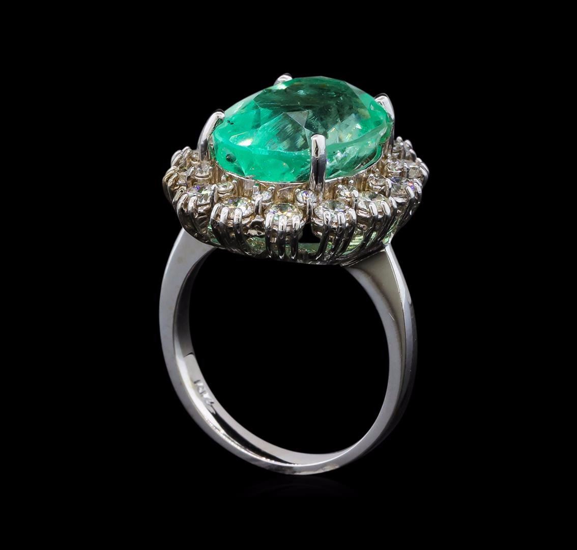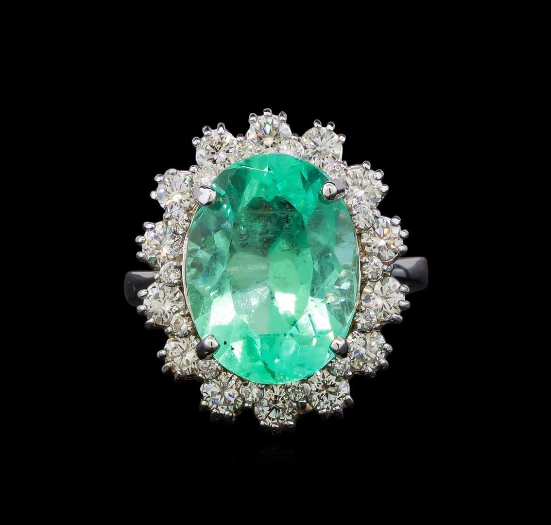 One electronically tested 14KT white gold lady's cast fashion ring with a double basket halo with a bright polish finish. The featured lady's ring has a shank measuring 2.68 millimeters wide. Identified with markings of 'K14'. Condition is new, good workmanship. Containing: One prong set oval modified brilliant cut natural emerald, measuring 15.00 x 11.21 x 8.96mm, (depth est.) 4%. bulge factor, approximate weight of 8.94ct., clarity is slightly included, medium, moderately strong, green color, (GIA G 5/4), cut is very good. Transmitting light with a minimum of distortion, transparent. Naturally occurring internal & external characteristics are present. Indications of oil residue. Colored gemstones are presumed to have been subjected to commonly used enhancement processes. Graded loose prior to setting in the GIA Laboratory, Report #6177665125. Fourteen prong set round brilliant cut diamonds, measuring 2.80 - 2.70 x 1.71mm (depth est.) approximate total weight of 14 Stones = 1.14ct. Graded in the setting. Clarity SI-1 to I-1. Color: H - I Cut Very Good Fourteen prong set round brilliant cut diamonds, measuring 1.40 - 1.30 x 0.84mm (depth est.) approximate total weight of 14 Stones = 0.13ct. Graded in the setting. Clarity SI-1 to SI-2. Color: H - I Cut Good. Total Weight of Colored Stones 8.94ct.. Total Weight of Diamonds 1.27ct.. Total Weight of Ring 7.50gm. GAS Appraised at $24,890.00.