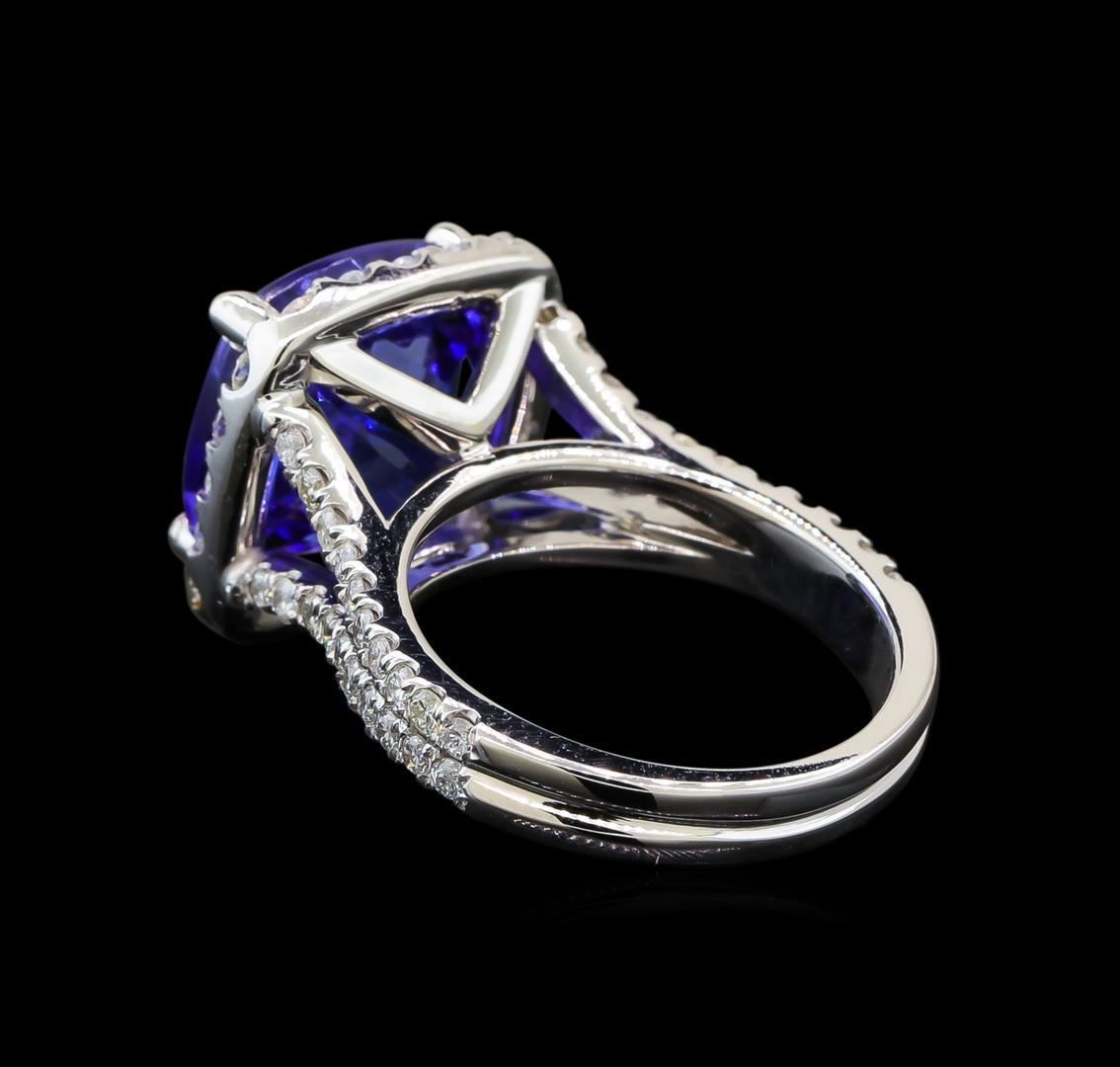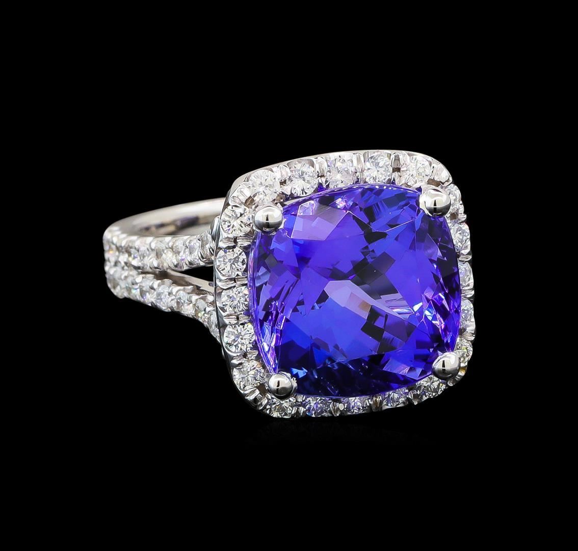One electronically tested 14KT white gold lady's cast fashion ring with a split shank basket halo with a bright polish finish. The featured lady's ring has a double shank measuring 3.42 millimeters wide. Identified with markings of '14K'. Condition is new, good workmanship. Containing: One prong set square cushion modified brilliant cut natural tanzanite, measuring 11.80 x 11.71 x 8.63mm, (depth est.) approximate weight of 9.06ct., clarity is eye clean, medium dark, moderately strong, bluish violet color, (GIA bV 6/4), cut is very good. Transmitting light with no distortion, transparent. Colored gemstones are presumed to have been subjected to commonly used enhancement processes. Graded loose prior to setting in the GIA Laboratory, Report #1176665868. Sixty prong set round brilliant cut diamonds, measuring 1.65 - 1.55 x 0.99mm (depth est.) approximate total weight of 60 Stones = 0.95ct. Graded in the setting. Clarity SI-1 to I-1. Color: G - H Cut Good. Total Weight of Colored Stones 9.06ct.. Total Weight of Diamonds 0.95ct.. Total Weight of Ring 8.40gm. GAS Appraised.