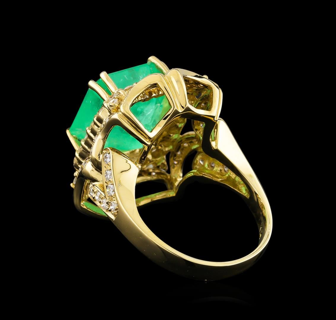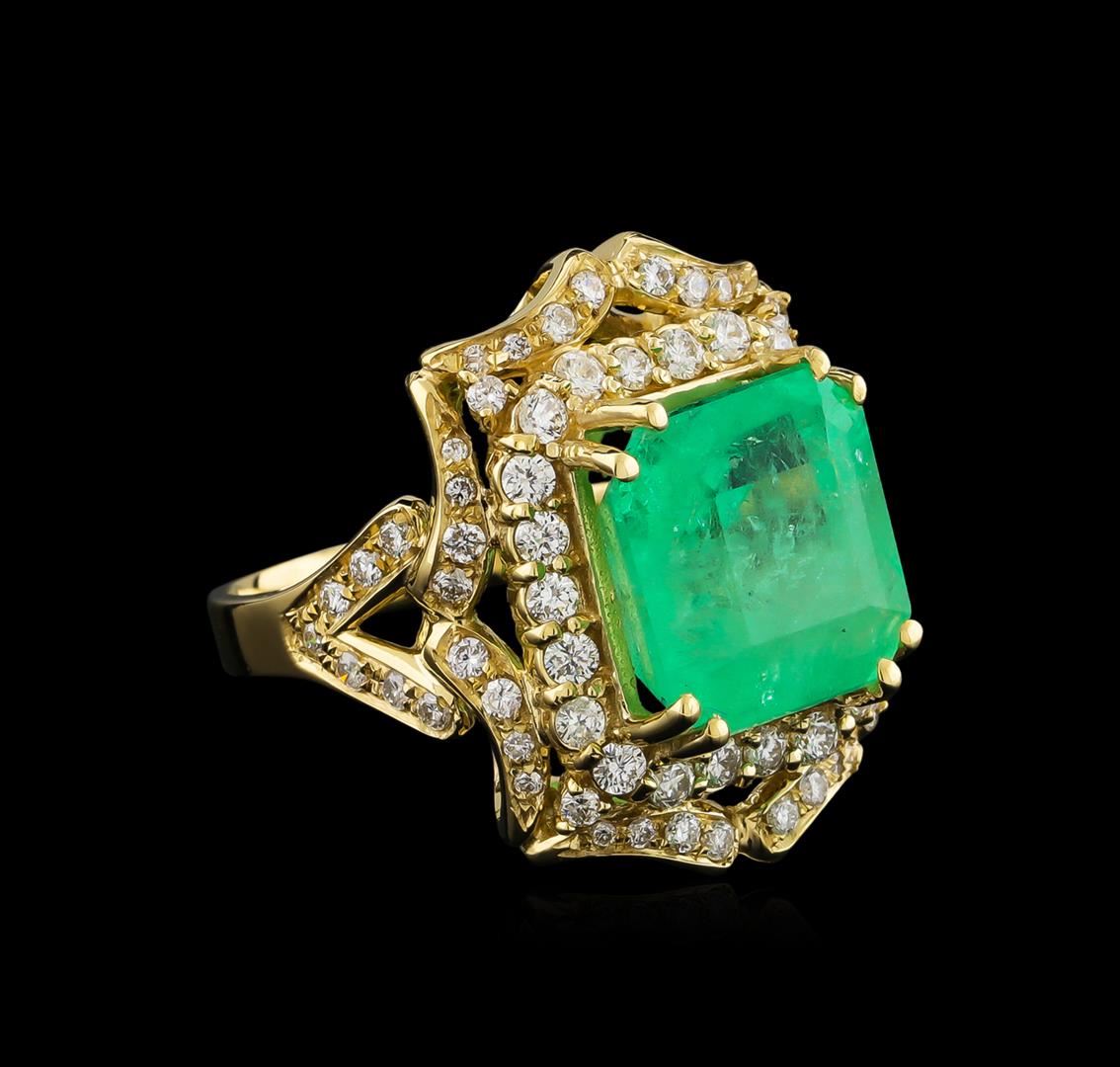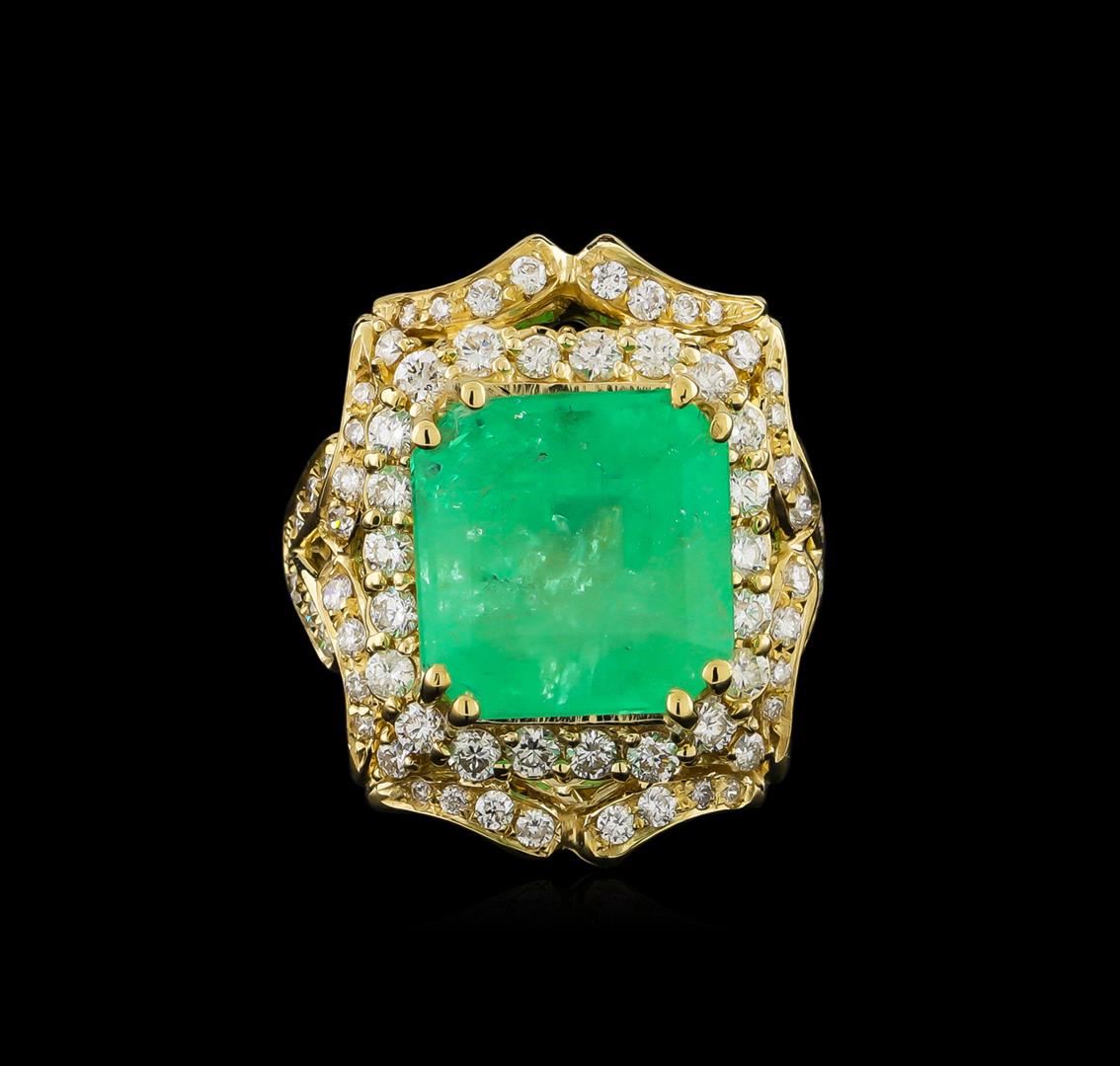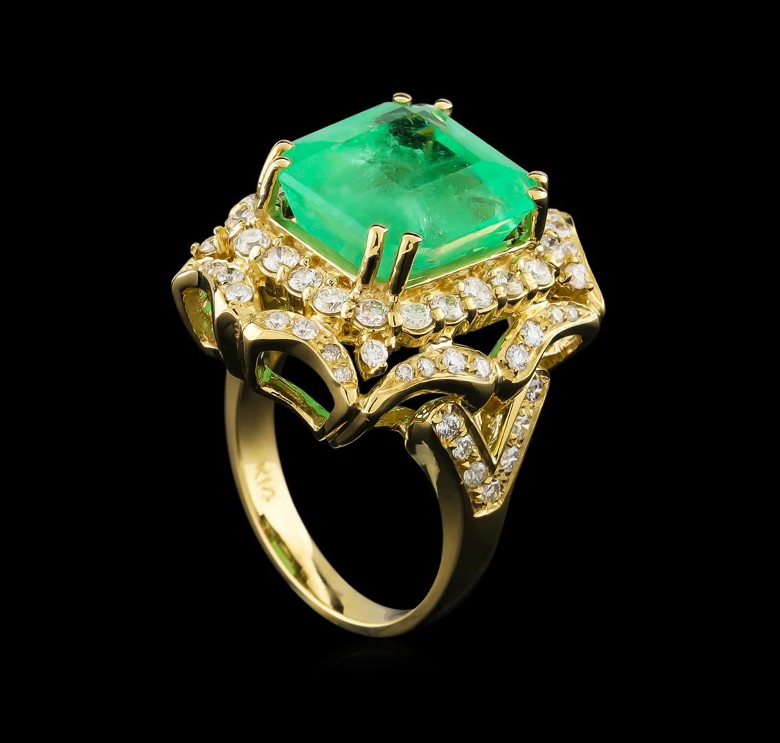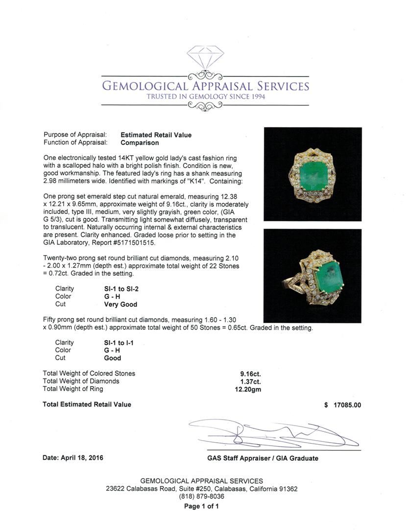 One electronically tested 14KT yellow gold lady's cast fashion ring with a scalloped halo with a bright polish finish. The featured lady's ring has a shank measuring 2.98 millimeters wide. Identified with markings of "K14". Condition is new, good workmanship. Containing: One prong set emerald step cut natural emerald, measuring 12.38 x 12.21 x 9.65mm, approximate weight of 9.16ct., clarity is moderately included, type III, medium, very slightly grayish, green color, (GIA G 5/3), cut is good. Transmitting light somewhat diffusely, transparent to translucent. Naturally occurring internal & external characteristics are present. Clarity enhanced. Graded loose prior to setting in the GIA Laboratory, Report #5171501515.Twenty-Two prong set round brilliant cut diamonds, measuring 2.10 - 2.00 x 1.27mm (depth est.) approximate total weight of 22 Stones = 0.72ct. Graded in the setting. Clarity: SI-1 to SI-2. Color: G - Very Good Fifty prong set round brilliant cut diamonds, measuring 1.60 - 1.30 x 0.90mm (depth est.) approximate total weight of 50 Stones = 0.65ct. Graded in the setting. Clarity: SI-1 to I-1. Color: G - Good. Total Weight of Colored Stones 9.16ct. Total Weight of Diamonds 1.37ct. Total Weight of Ring 12.20gm. GAS Appraised at $17,085.00.