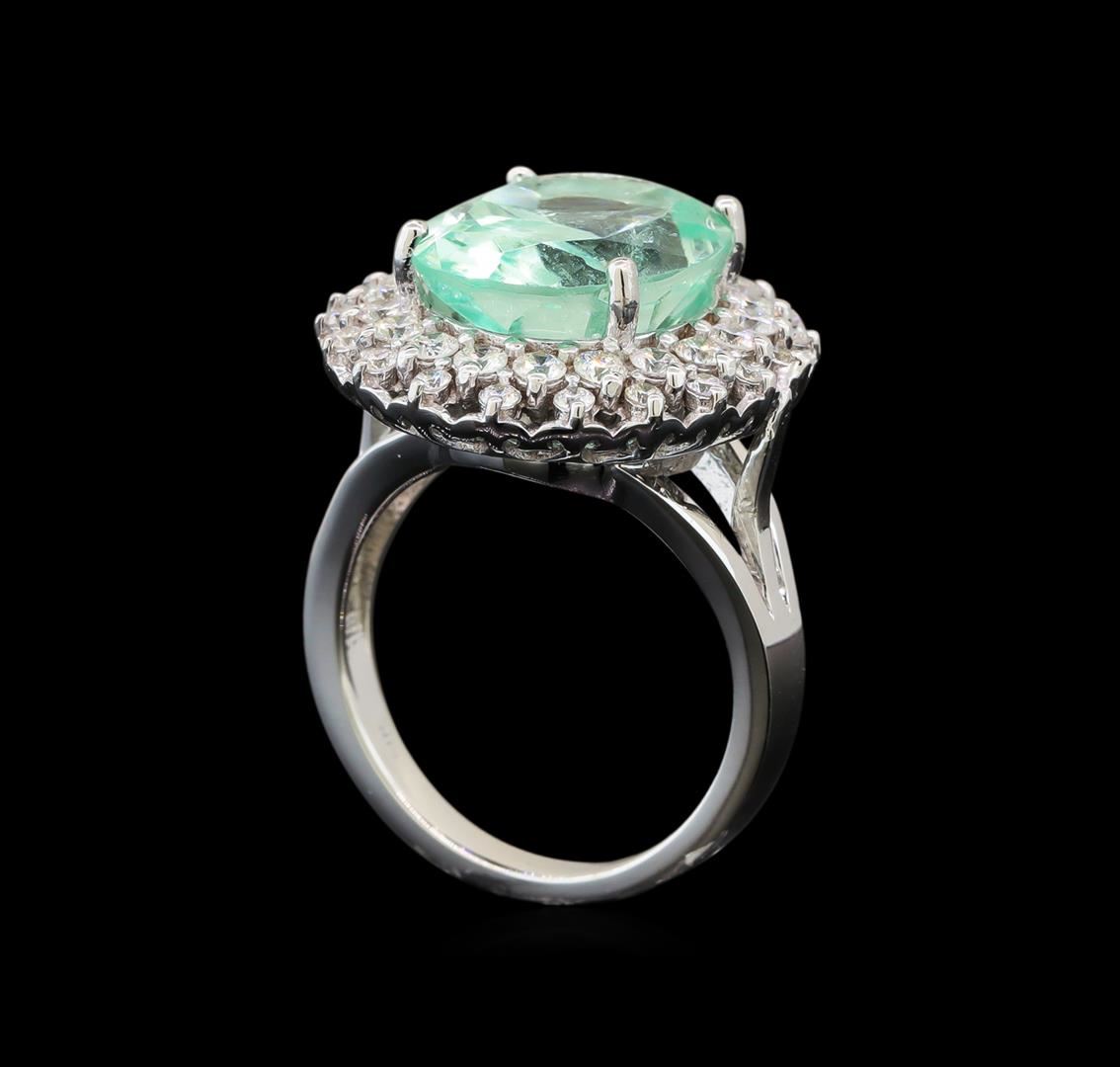 One electronically tested 14KT white gold lady's cast fashion ring with a split shank double basket halo with a bright polish finish. The featured lady's ring has a shank measuring 2.67 millimeters wide. Identified with markings of '14K'. Condition is new, good workmanship. Containing: One prong set oval modified brilliant cut natural emerald, measuring 15.46 x 12.34 x 8.78mm, (depth est.) approximate weight of 9.25ct., clarity is slightly included, light, moderately strong, green color, (GIA G 3/4), cut is fair. Transmitting light with a minimum of distortion, transparent. Clarity enhanced. Colored gemstones are presumed to have been subjected to commonly used enhancement processes. Graded loose prior to setting in the GIA Laboratory, Report #1176664620. Twenty prong set round brilliant cut diamonds, measuring 2.40 - 2.30 x 1.41mm (depth est.) approximate total weight of 20 Stones = 0.94ct. Graded in the setting. Clarity SI-1 to I-1. Color: H - I Cut Good Twenty prong set round brilliant cut diamonds, measuring 1.70 - 1.60 x 0.99mm (depth est.) approximate total weight of 20 Stones = 0.32ct. Graded in the setting. Clarity SI-1 to SI-2. Color: H - I Cut Good. Total Weight of Colored Stones 9.25ct.. Total Weight of Diamonds 1.26ct.. Total Weight of Ring 11.40gm. GAS Appraised at $11,865.00.