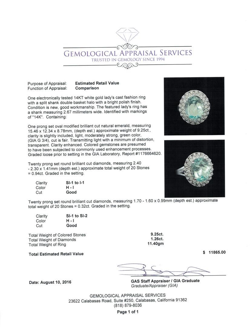 One electronically tested 14KT white gold lady's cast fashion ring with a split shank double basket halo with a bright polish finish. The featured lady's ring has a shank measuring 2.67 millimeters wide. Identified with markings of '14K'. Condition is new, good workmanship. Containing: One prong set oval modified brilliant cut natural emerald, measuring 15.46 x 12.34 x 8.78mm, (depth est.) approximate weight of 9.25ct., clarity is slightly included, light, moderately strong, green color, (GIA G 3/4), cut is fair. Transmitting light with a minimum of distortion, transparent. Clarity enhanced. Colored gemstones are presumed to have been subjected to commonly used enhancement processes. Graded loose prior to setting in the GIA Laboratory, Report #1176664620. Twenty prong set round brilliant cut diamonds, measuring 2.40 - 2.30 x 1.41mm (depth est.) approximate total weight of 20 Stones = 0.94ct. Graded in the setting. Clarity SI-1 to I-1. Color: H - I Cut Good Twenty prong set round brilliant cut diamonds, measuring 1.70 - 1.60 x 0.99mm (depth est.) approximate total weight of 20 Stones = 0.32ct. Graded in the setting. Clarity SI-1 to SI-2. Color: H - I Cut Good. Total Weight of Colored Stones 9.25ct.. Total Weight of Diamonds 1.26ct.. Total Weight of Ring 11.40gm.