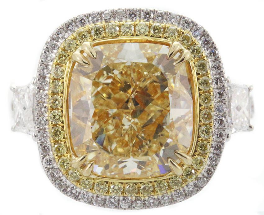One GIA certified 18KT yellow gold ring weighing 10.37 grams containing: One cushion modified brilliant cut fancy yellow diamond weighing 7.57ct. Measurements: 11.35 x 10.45 x 7.16 mm. Color grade: Y to Z. Clarity grade: SI1. The ring also contains 34 yellow diamonds weighing 0.24ct, 2 trilliant cut diamonds weighing 0.48ct, and 80 round diamonds weighing 0.98ct. GIA Appraised.
