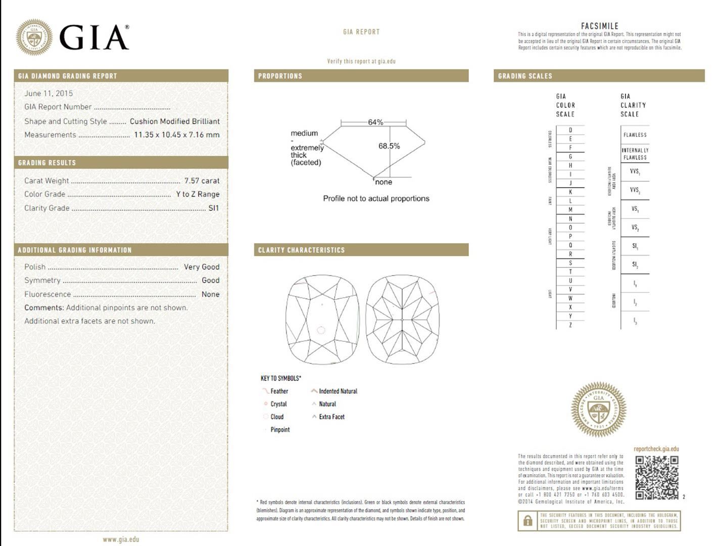 One GIA certified 18KT yellow gold ring weighing 10.37 grams containing: One cushion modified brilliant cut fancy yellow diamond weighing 7.57ct. Measurements: 11.35 x 10.45 x 7.16 mm. Color grade: Y to Z. Clarity grade: SI1. The ring also contains 34 yellow diamonds weighing 0.24ct, 2 trilliant cut diamonds weighing 0.48ct, and 80 round diamonds weighing 0.98ct. GIA Appraised.