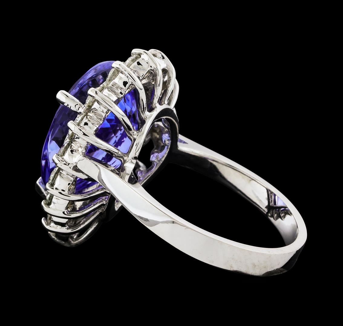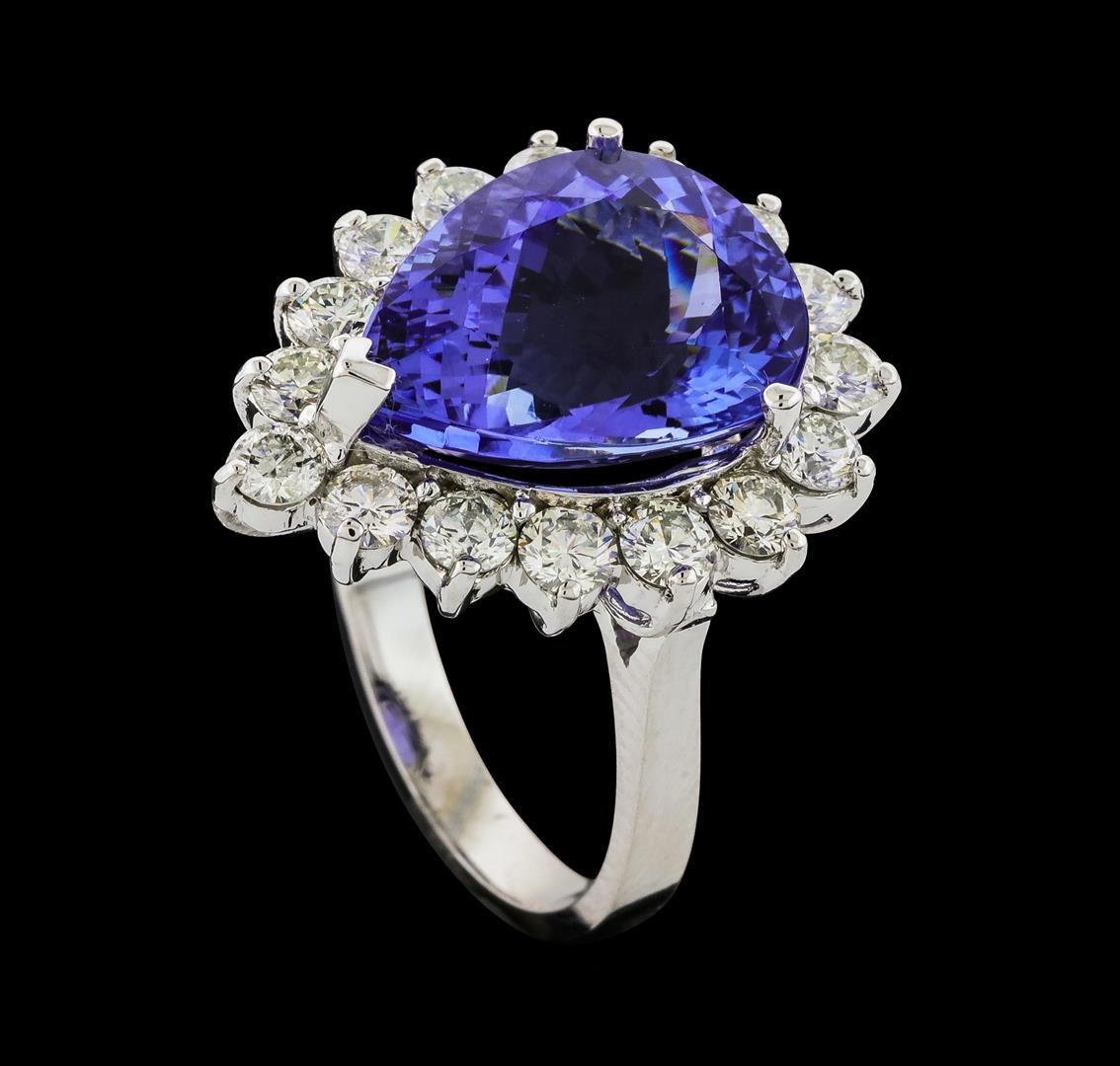 One electronically tested 14KT white gold lady's cast fashion ring with a basket halo with a bright polish finish. The featured lady's ring has a shank measuring 2.80 millimeters wide. Identified with markings of 'K14'. Condition is new, good workmanship. Containing: One prong set pear modified brilliant cut natural tanzanite, measuring 15.32 x 11.80 x 7.90mm, (depth est.) approximate weight of 9.31ct., clarity is eye clean, medium light, moderately strong, violet color, (GIA V 4/4), cut is very good. Transmitting light with no distortion, transparent. Colored gemstones are presumed to have been subjected to commonly used enhancement processes. Graded loose prior to setting in the GIA Laboratory, Report #6177847911. Sixteen prong set round brilliant cut diamonds, measuring 3.10 - 3.00 x 1.83mm (depth est.) approximate total weight of 16 Stones = 1.66ct. Graded in the setting. Clarity SI-1 to I-1. Color: H - I Cut Good. Total Weight of Colored Stones 9.31ct.. Total Weight of Diamonds 1.66ct.. Total Weight of Ring 8.10gm. GAS Appraised at $12,890.00.