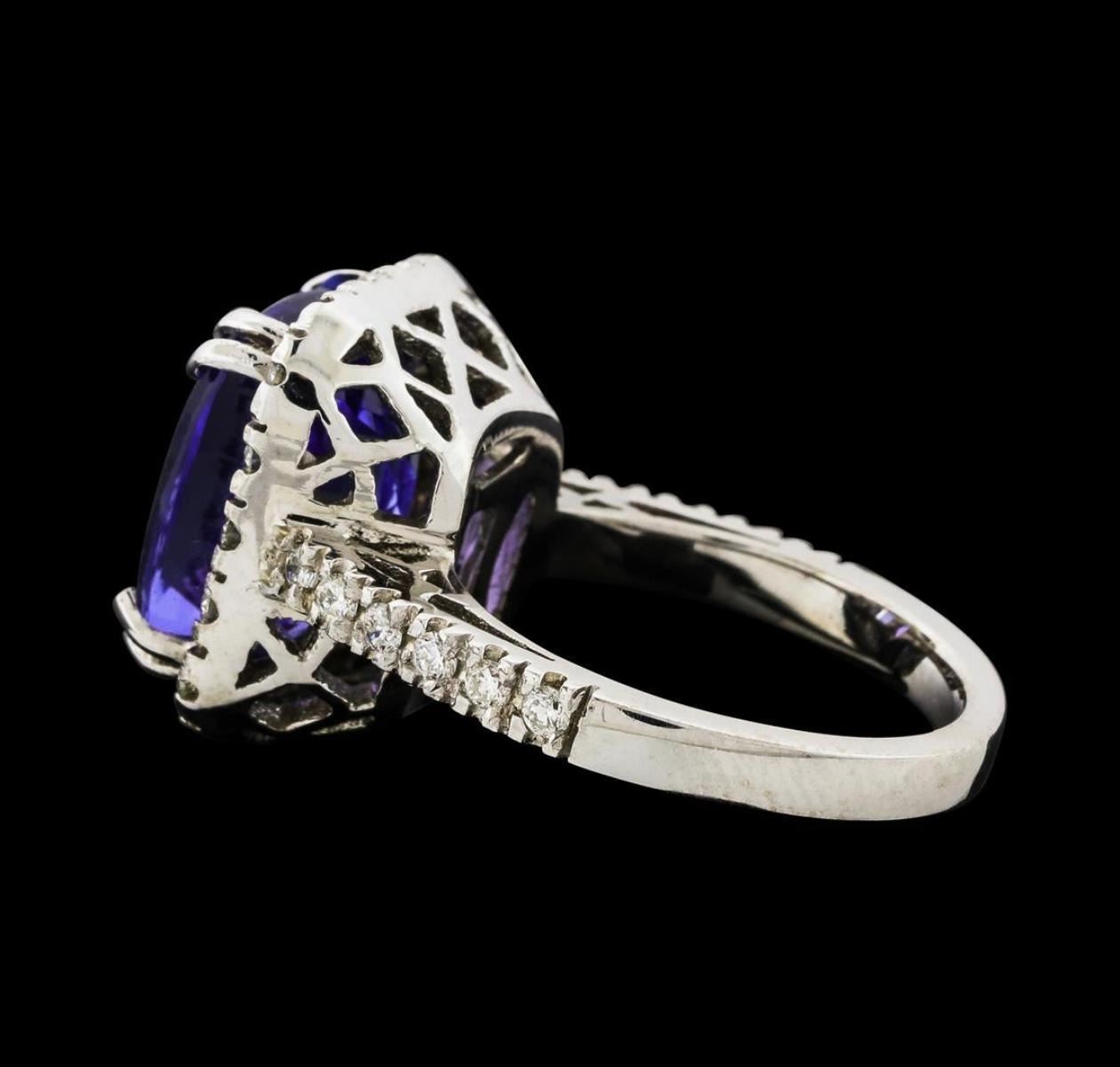 One electronically tested 14KT white gold lady's cast fashion ring with a basket halo with a bright polish finish. The featured lady's ring has a shank measuring 2.55 millimeters wide. Identified with markings of '14K'. Condition is new, good workmanship. Containing: One prong set rectangular cushion modified brilliant cut natural tanzanite, measuring 12.78 x 11.17 x 7.60mm, (depth est.) 10%. bulge factor, approximate weight of 9.36ct., clarity is eye clean, medium, moderately strong, bluish violet color, (GIA bV 5/4), cut is very good. Transmitting light with no distortion, transparent. Colored gemstones are presumed to have been subjected to commonly used enhancement processes. Graded loose prior to setting in the GIA Laboratory, Report #2175847046. Thirty prong set round brilliant cut diamonds, measuring 1.80 - 1.75 x 1.10mm (depth est.) approximate total weight of 30 Stones = 0.65ct. Graded in the setting. Clarity SI-1 to SI-2. Color: H - I Cut Good. Total Weight of Colored Stones 9.36ct.. Total Weight of Diamonds 0.65ct.. Total Weight of Ring 9.50gm. GAS Appraised.