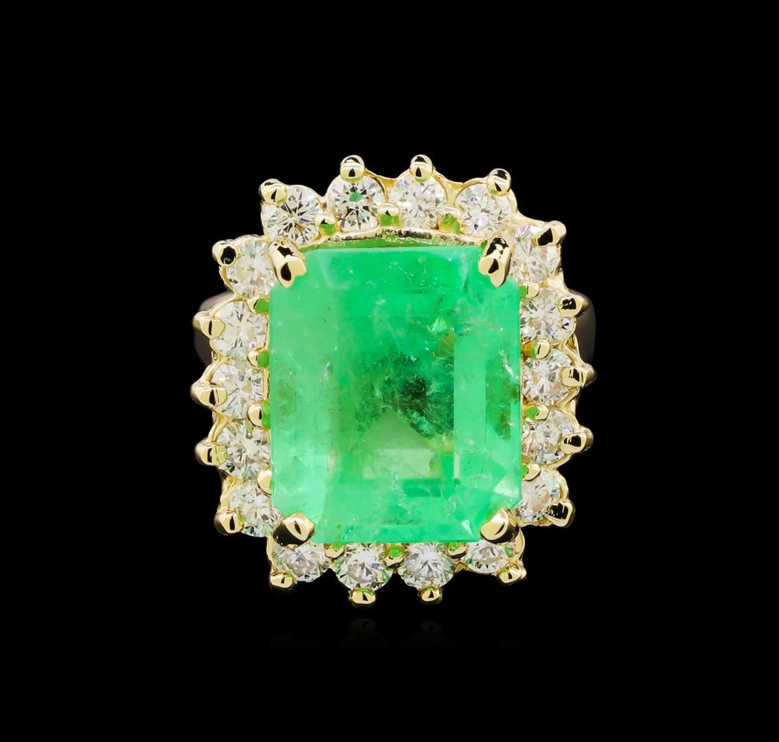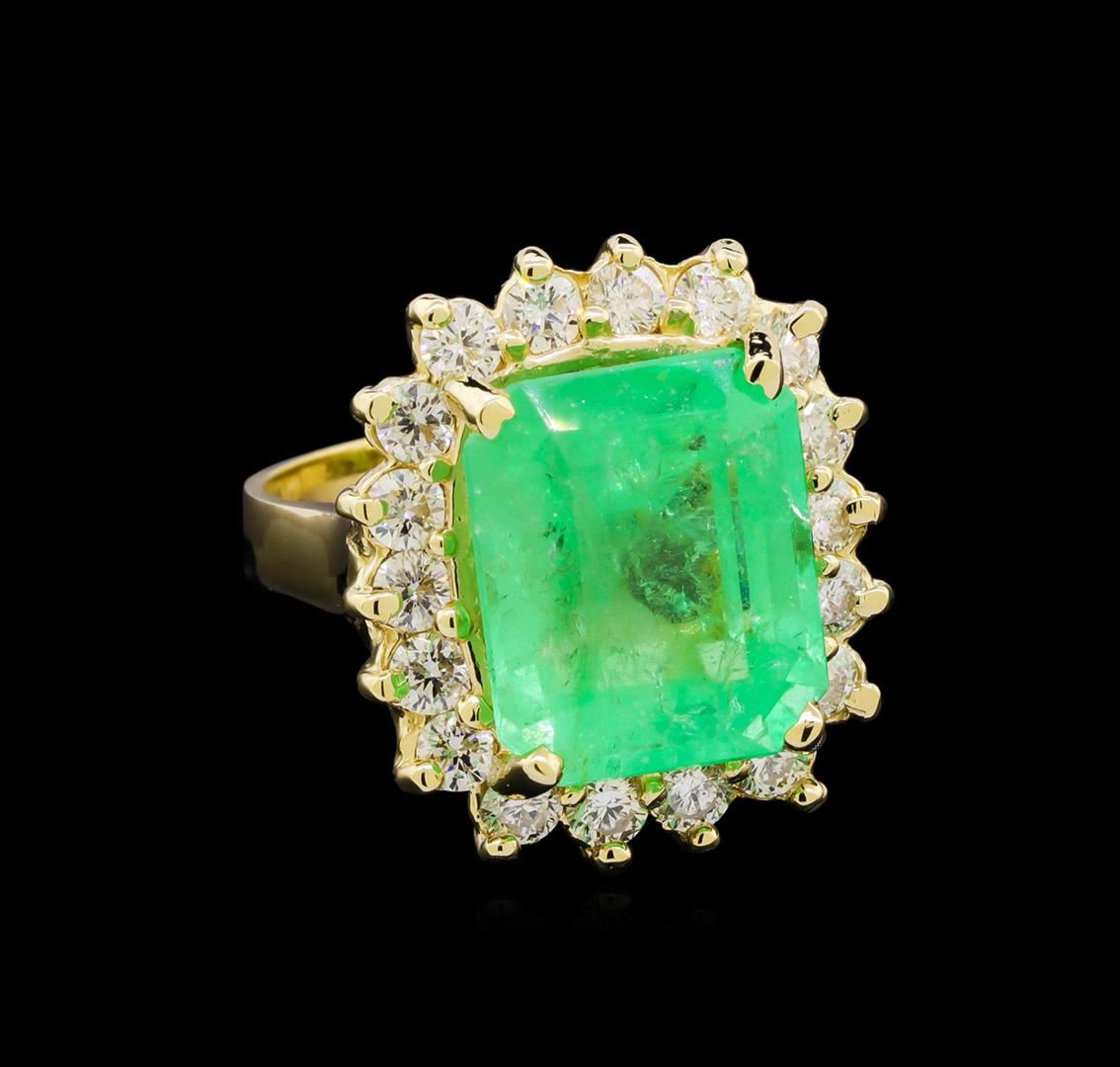 One electronically tested 14KT yellow gold lady's cast fashion ring with a basket halo with a bright polish finish. The featured lady's ring has a shank measuring 2.90 millimeters wide. Identified with markings of "14K". Condition is new, good workmanship. Containing: One prong set emerald step cut natural emerald, measuring 13.81 x 11.57 x 8.56mm, approximate weight of 9.39ct., clarity is moderately included, type III, medium, very slightly grayish, green color, (GIA G 5/3), cut is good. Transmitting light somewhat diffusely, transparent to translucent. Naturally occurring internal & external characteristics are present. Clarity enhanced. Graded loose prior to setting in the GIA Laboratory, Report #2175501539.Eighteen prong set round brilliant cut diamonds, measuring 2.80 - 2.70 x 1.68mm (depth est.) approximate total weight of 18 Stones = 1.40ct. Graded in the setting. Clarity: VS-2 to SI-2. Color: H - I. Cut Good. Total Weight of Colored Stones 9.39ct. Total Weight of Diamonds 1.40ct. Total Weight of Ring 10.20gm. GAS Appraised at $21,700.00.