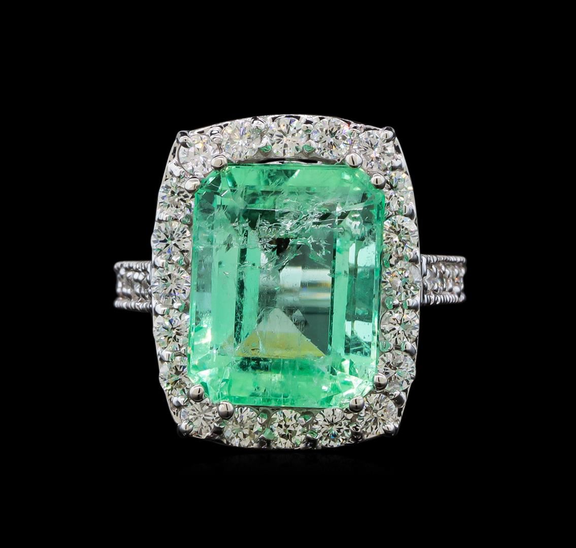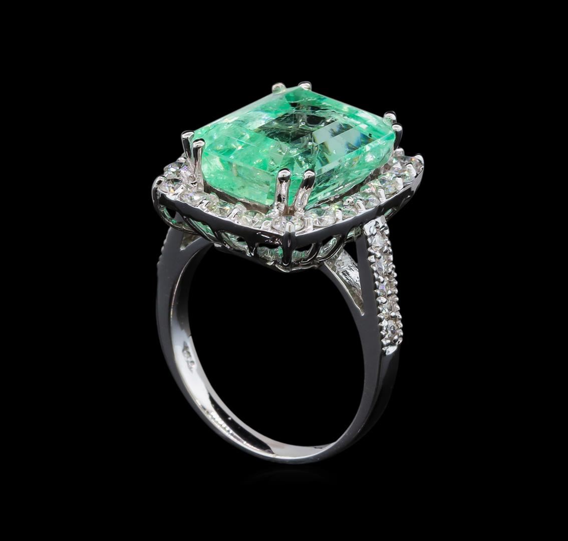 One electronically tested 14KT white gold lady's cast fashion ring with a cathedral shank with a basket halo with a bright polish with milgrain detailing finish. The featured lady's ring has a shank measuring 2.55 millimeters wide. Identified with markings of 'K14'. Condition is new, good workmanship. Containing: One prong set emerald standard step cut natural emerald, measuring 14.00 x 10.99 x 8.36mm, (depth est.) approximate weight of 9.44ct., clarity is moderately included, medium light, moderately strong, green color, (GIA G 4/4), cut is very good. Transmitting light somewhat diffusely, transparent to translucent. Naturally occurring internal & external characteristics are present. Indications of oil residue. Colored gemstones are presumed to have been subjected to commonly used enhancement processes. Graded in the setting. Twenty prong set round brilliant cut diamonds, measuring 2.40 - 2.30 x 1.46mm (depth est.) approximate total weight of 20 Stones = 0.98ct. Graded in the setting. Clarity SI-1 to SI-2. Color: H - I Cut Good Ten prong set round brilliant cut diamonds, measuring 1.70 - 1.60 x 1.02mm (depth est.) approximate total weight of 10 Stones = 0.17ct. Graded in the setting. Clarity SI-1 to SI-2. Color: H - I Cut Good. Total Weight of Colored Stones 9.44ct.. Total Weight of Diamonds 1.15ct.. Total Weight of Ring 7.60gm. GAS Appraised at $17,395.00.