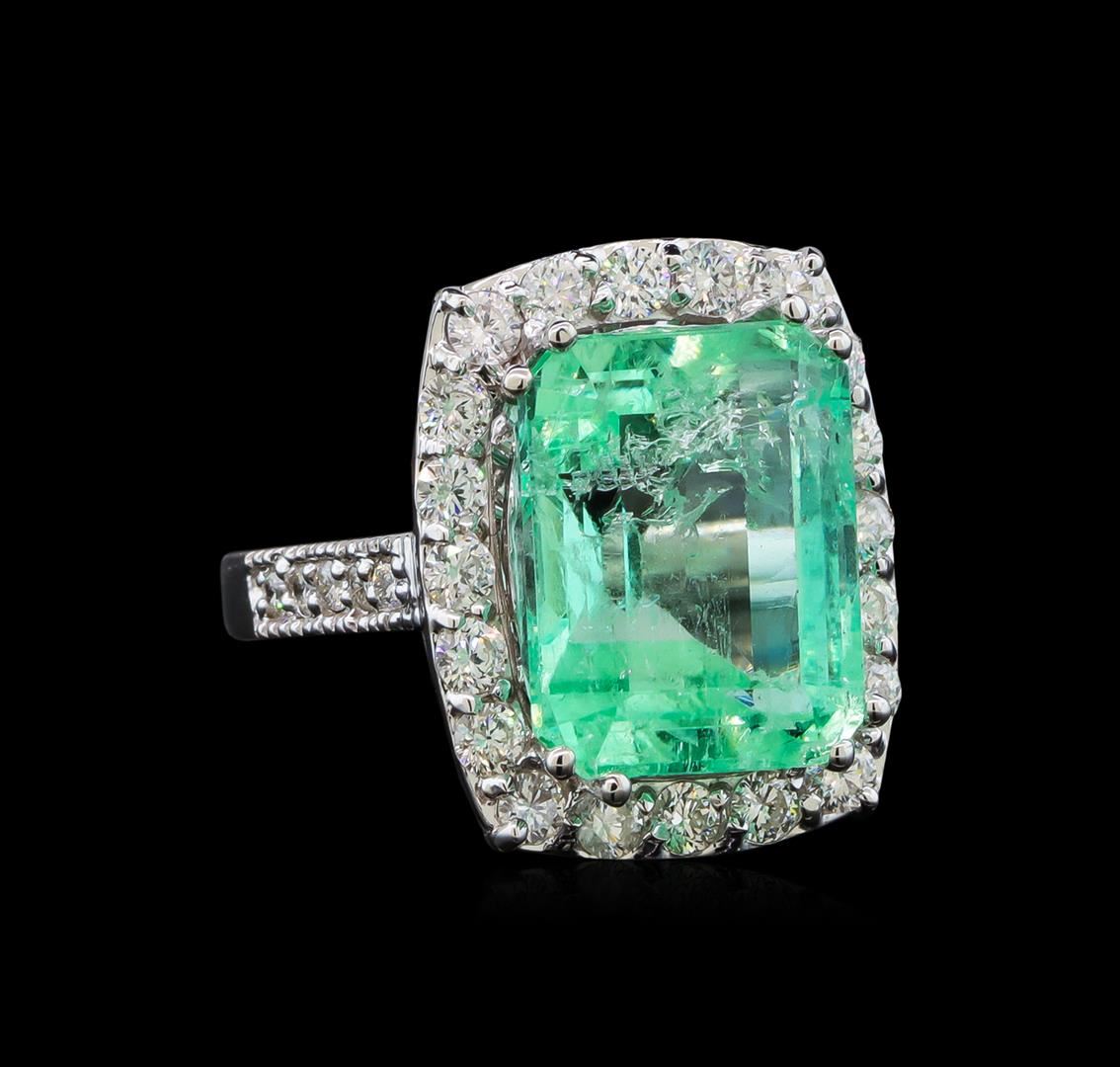 One electronically tested 14KT white gold lady's cast fashion ring with a cathedral shank with a basket halo with a bright polish with milgrain detailing finish. The featured lady's ring has a shank measuring 2.55 millimeters wide. Identified with markings of 'K14'. Condition is new, good workmanship. Containing: One prong set emerald standard step cut natural emerald, measuring 14.00 x 10.99 x 8.36mm, (depth est.) approximate weight of 9.44ct., clarity is moderately included, medium light, moderately strong, green color, (GIA G 4/4), cut is very good. Transmitting light somewhat diffusely, transparent to translucent. Naturally occurring internal & external characteristics are present. Indications of oil residue. Colored gemstones are presumed to have been subjected to commonly used enhancement processes. Graded in the setting. Twenty prong set round brilliant cut diamonds, measuring 2.40 - 2.30 x 1.46mm (depth est.) approximate total weight of 20 Stones = 0.98ct. Graded in the setting. Clarity SI-1 to SI-2. Color: H - I Cut Good Ten prong set round brilliant cut diamonds, measuring 1.70 - 1.60 x 1.02mm (depth est.) approximate total weight of 10 Stones = 0.17ct. Graded in the setting. Clarity SI-1 to SI-2. Color: H - I Cut Good. Total Weight of Colored Stones 9.44ct.. Total Weight of Diamonds 1.15ct.. Total Weight of Ring 7.60gm. GAS Appraised at $17,395.00.