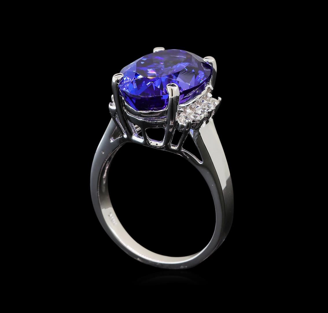 One electronically tested 14KT white gold lady's cast fashion ring with a cathedral shank with a bright polish finish. The featured lady's ring has a shank measuring 2.20 millimeters wide. Identified with markings of '14K'. Condition is new, good workmanship. Containing: One prong set oval modified brilliant cut natural tanzanite, measuring 15.15 x 11.36 x 7.42mm, (depth est.) 5%. bulge factor, approximate weight of 9.49ct., clarity is eye clean, medium dark, moderately strong, violetish blue color, (GIA vB 6/4), cut is very good. Transmitting light with no distortion, transparent. Colored gemstones are presumed to have been subjected to commonly used enhancement processes. Graded loose prior to setting in the GIA Laboratory, Report #1172665881. Ten prong set round brilliant cut diamonds, measuring 2.00 - 1.90 x 1.17mm (depth est.) approximate total weight of 10 Stones = 0.26ct. Graded in the setting. Clarity SI-1 to I-1. Color: H - I Cut Good. Total Weight of Colored Stones 9.49ct.. Total Weight of Diamonds 0.26ct.. Total Weight of Ring 7.50gm. GAS Appraised at $17,880.00.