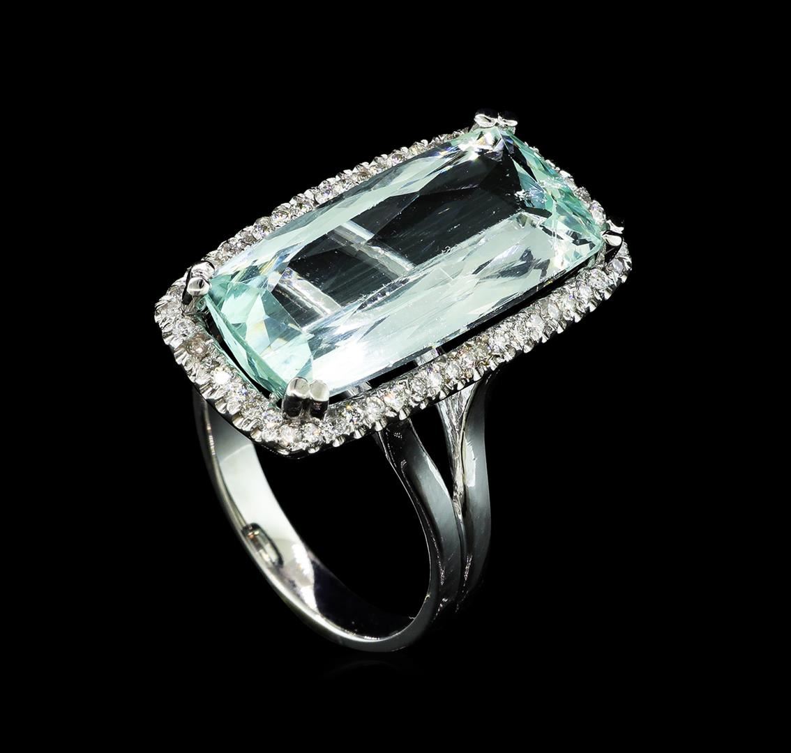 One electronically tested 14KT white gold lady's cast fashion ring with a split shank basket halo with a bright polish finish. The featured ladies ring has a shank measuring 3.00 millimeters in width. Identified with markings of 'K14'. Condition is new, good workmanship. Containing: One prong set rectangular cushion modified brilliant cut natural aquamarine, measuring 20.93 x 9.89 x 5.99mm, (depth est.) 20%. bulge factor, approximate weight of 9.59ct., clarity is eye clean, very light, strong, very slightly greenish blue color, (GIA vslgB 2/5), cut is very good. Transmitting light with no distortion, transparent. Colored gemstones are presumed to have been subjected to commonly used enhancement processes. Graded loose prior to setting in the GIA Laboratory, Report #2151953585. Fifty-Two prong set round brilliant cut diamonds, measuring 1.40 - 1.30 x 0.82mm (depth est.) approximate total weight of 52 Stones = 0.47ct. Graded in the setting. Clarity SI-1 to I-1. Color: G - I Cut Good. Total Weight of Colored Stones 9.59ct.. Total Weight of Diamonds 0.47ct.. Total Weight of Ring 7.60gm GAS Appraised at $11,990.00.