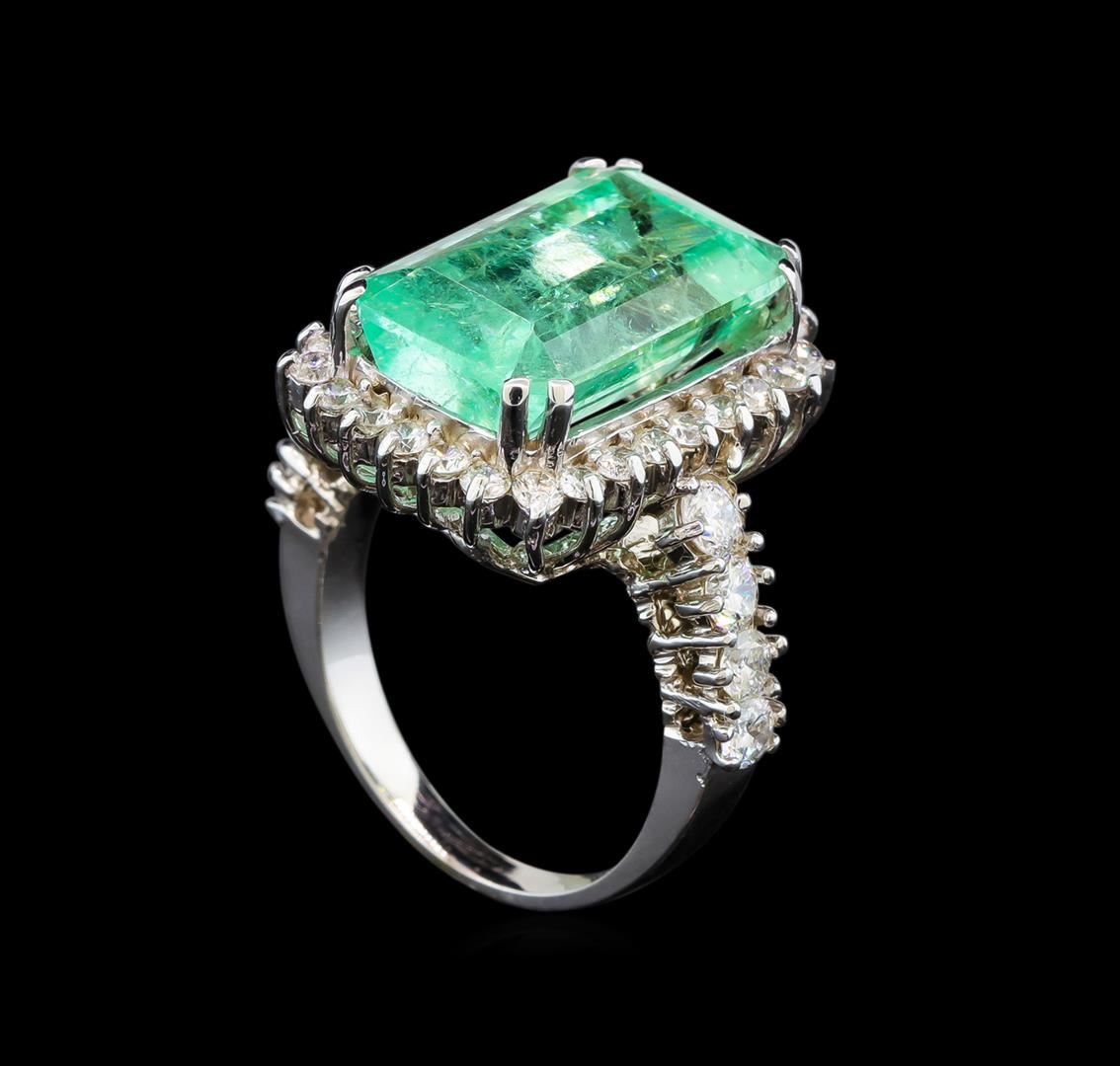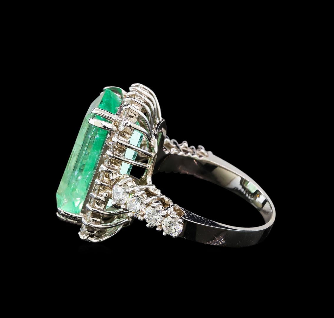 One electronically tested 14KT white gold lady's cast fashion ring with a basket halo with a bright polish finish. The featured lady's ring has a shank measuring 2.38 millimeters wide. Identified with markings of 'K14'. Condition is new, good workmanship. Containing: One prong set emerald standard step cut natural emerald, measuring 16.18 x 10.35 x 7.97mm, (depth est.) approximate weight of 9.60ct., clarity is heavily included, medium, moderately strong, green color, (GIA G 5/4), cut is very good. Transmitting light somewhat diffusely, transparent to translucent. Naturally occurring internal & external characteristics are present. Indications of oil residue. Clarity enhanced. Colored gemstones are presumed to have been subjected to commonly used enhancement processes. Graded loose prior to setting in the GIA Laboratory, Report #2175664595. Eight round brilliant cut diamonds, measuring 3.10 - 2.80 x 1.83mm (depth est.) approximate total weight of 8 Stones = 0.80ct. Graded in the setting. Twenty-Eight round brilliant cut diamonds, measuring 1.90 - 1.80 x 1.13mm (depth est.) approximate total weight of 28 Stones = 0.65ct. Graded in the setting. Total Weight of Colored Stones 9.60ct.. Total Weight of Diamonds 1.45ct.. Total Weight of Ring 8.40gm. GAS Appraised at $22,750.00.