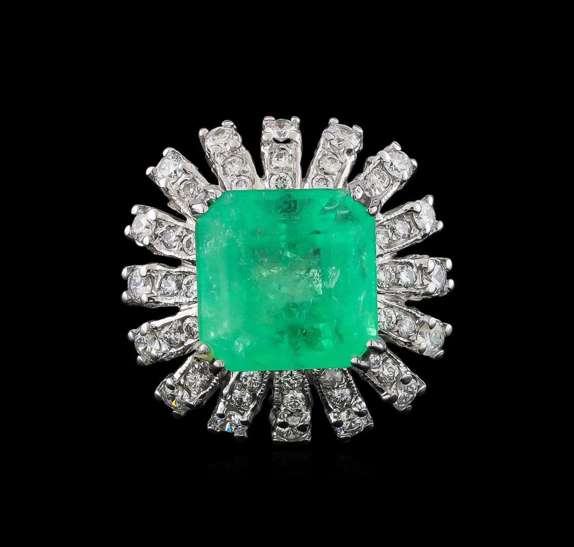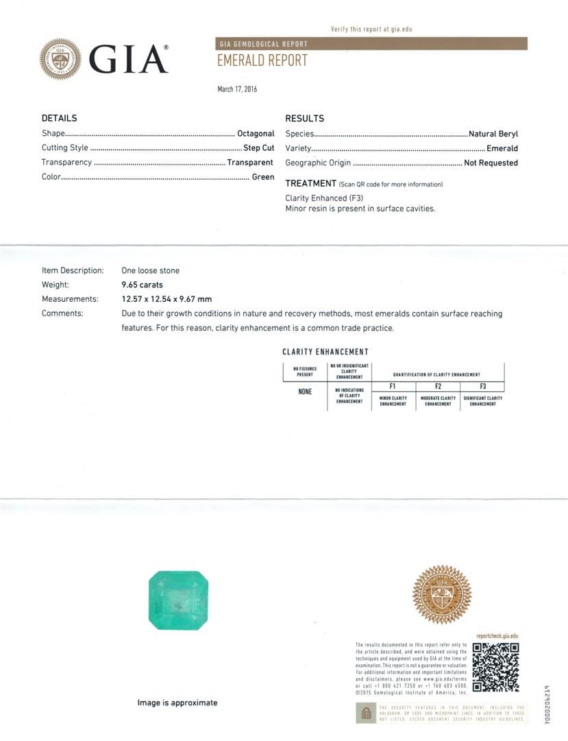 One electronically tested 14KT white gold lady's cast fashion ring with a triple basket halo with a bright polish with milgrain detailing finish. The featured lady's ring has a shank measuring 2.82 millimeters wide. Identified with markings of "K14". Condition is new, good workmanship. Containing: One prong set emerald step cut natural emerald, measuring 12.57 x 12.54 x 9.67mm, exact weight 9.65ct., clarity is moderately included, type III, medium, very slightly grayish, green color, (GIA G 5/3), cut is good. Transmitting light somewhat diffusely, transparent to translucent. Naturally occurring internal & external characteristics are present. Clarity enhanced. Graded loose prior to setting in the GIA Laboratory, Report #6173501590.Seventeen prong set round brilliant cut diamonds, measuring 2.40 - 2.30 x 1.46mm (depth est.) approximate total weight of 17 Stones = 0.86ct. Graded in the setting. Clarity: SI-1 to SI-2. Color: H - I. Cut Good Thirty-Four prong set round brilliant cut diamonds, measuring 1.60 - 1.50 x 0.96mm (depth est.) approximate total weight of 34 Stones = 0.50ct. Graded in the setting. Clarity: SI-1 to SI-2. Color: H - I. Cut Good. Total Weight of Colored Stones 9.65ct. Total Weight of Diamonds 1.36ct. Total Weight of Ring 9.70gm. GAS Appraised at $14,110.00.