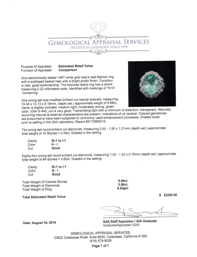 One electronically tested 14KT white gold lady's cast fashion ring with a scalloped basket halo with a bright polish finish. The featured lady's ring has a shank measuring 2.22 millimeters wide. Identified with markings of 'K14'. Condition is new, good workmanship. Containing: One prong set oval modified brilliant cut natural emerald, measuring 15.44 x 12.13 x 9.19mm, (depth est.) approximate weight of 9.68ct., clarity is slightly included, medium light, moderately strong, green color, (GIA G 4/4), cut is very good. Transmitting light with a minimum of distortion, transparent. Naturally occurring internal & external characteristics are present. Indications of oil residue. Colored gemstones are presumed to have been subjected to commonly used enhancement processes. Graded loose prior to setting in the GIA Laboratory, Report #5172665019. Ten prong set round brilliant cut diamonds, measuring 2.00 - 1.90 x 1.21mm (depth est.) approximate total weight of 10 Stones = 0.28ct. Graded in the setting. Clarity SI-1 to I-1. Color: H - I Cut Good Eighty-Four prong set round brilliant cut diamonds, measuring 1.30 - 1.20 x 0.75mm (depth est.) approximate total weight of 84 Stones = 0.60ct. Graded in the setting. Clarity SI-1 to I-1. Color: G - I Cut Good. Total Weight of Colored Stones 9.68ct.. Total Weight of Diamonds 0.88ct.. Total Weight of Ring 8.50gm. GAS Appraised at $22,230.00.