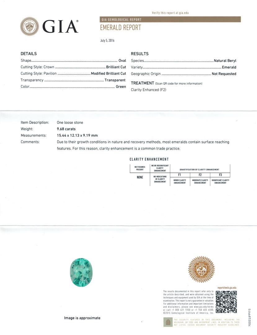 One electronically tested 14KT white gold lady's cast fashion ring with a scalloped basket halo with a bright polish finish. The featured lady's ring has a shank measuring 2.22 millimeters wide. Identified with markings of 'K14'. Condition is new, good workmanship. Containing: One prong set oval modified brilliant cut natural emerald, measuring 15.44 x 12.13 x 9.19mm, (depth est.) approximate weight of 9.68ct., clarity is slightly included, medium light, moderately strong, green color, (GIA G 4/4), cut is very good. Transmitting light with a minimum of distortion, transparent. Naturally occurring internal & external characteristics are present. Indications of oil residue. Colored gemstones are presumed to have been subjected to commonly used enhancement processes. Graded loose prior to setting in the GIA Laboratory, Report #5172665019. Ten prong set round brilliant cut diamonds, measuring 2.00 - 1.90 x 1.21mm (depth est.) approximate total weight of 10 Stones = 0.28ct. Graded in the setting. Clarity SI-1 to I-1. Color: H - I Cut Good Eighty-Four prong set round brilliant cut diamonds, measuring 1.30 - 1.20 x 0.75mm (depth est.) approximate total weight of 84 Stones = 0.60ct. Graded in the setting. Clarity SI-1 to I-1. Color: G - I Cut Good. Total Weight of Colored Stones 9.68ct.. Total Weight of Diamonds 0.88ct.. Total Weight of Ring 8.50gm. GAS Appraised at $22,230.00.