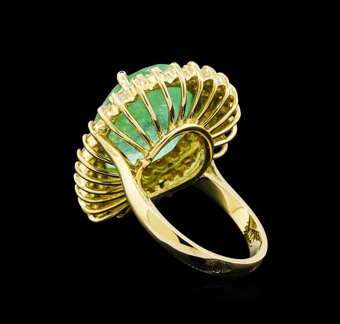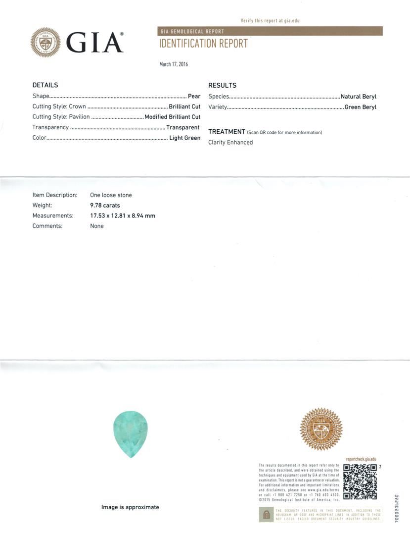 One electronically tested 14KT yellow gold lady's cast fashion ring with a double basket halo with a bright polish finish. The featured lady's ring has a shank measuring 2.81 millimeters wide. Identified with markings of "K14". Condition is new, good workmanship. Containing: One prong set pear modified brilliant cut natural emerald, measuring 17.53 x 12.81 x 8.94mm, exact weight 9.78ct., clarity is moderately included, type III, medium, very slightly grayish, green color, (GIA G 5/3), cut is good. Transmitting light somewhat diffusely, transparent to translucent. Naturally occurring internal & external characteristics are present. Clarity enhanced. Graded loose prior to setting in the GIA Laboratory, Report # 2175501595.Twenty-Seven prong set round brilliant cut diamonds, measuring 2.20 - 2.10 x 1.33mm (depth est.) approximate total weight of 27 Stones = 1.03ct. Graded in the setting. Clarity: VS-2 to SI-2. Color: H - I. Cut Good Twenty-Six prong set round brilliant cut diamonds, measuring 1.90 - 1.80 x 1.11mm (depth est.) approximate total weight of 26 Stones = 0.60ct. Graded in the setting. Clarity: VS-2 to SI-2. Color: H - I. Cut Good. Total Weight of Colored Stones 9.78ct. Total Weight of Diamonds 1.63ct. Total Weight of Ring 10.90gm. GAS Appraised at $15,740.00.