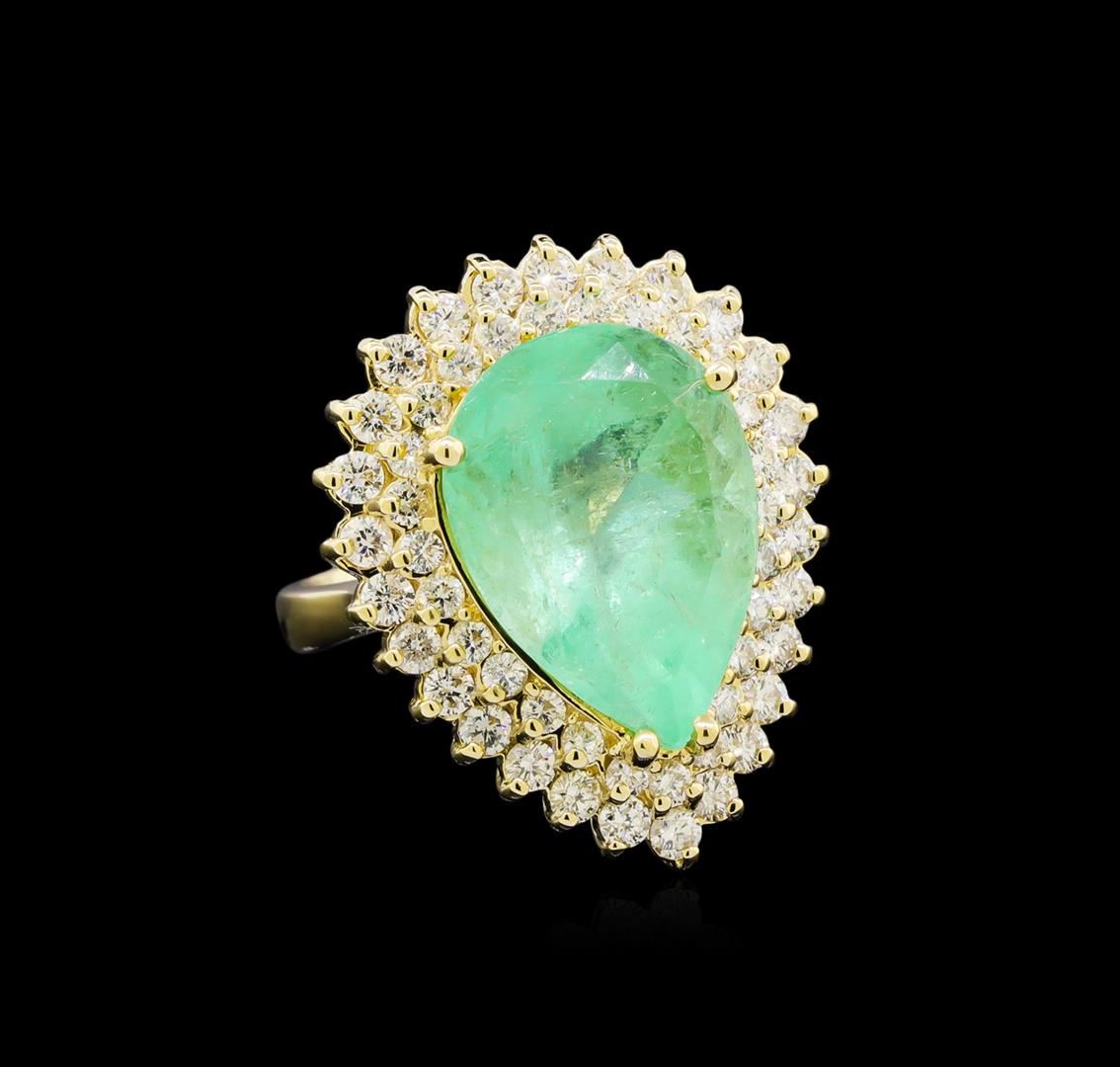 One electronically tested 14KT yellow gold lady's cast fashion ring with a double basket halo with a bright polish finish. The featured lady's ring has a shank measuring 2.81 millimeters wide. Identified with markings of "K14". Condition is new, good workmanship. Containing: One prong set pear modified brilliant cut natural emerald, measuring 17.53 x 12.81 x 8.94mm, exact weight 9.78ct., clarity is moderately included, type III, medium, very slightly grayish, green color, (GIA G 5/3), cut is good. Transmitting light somewhat diffusely, transparent to translucent. Naturally occurring internal & external characteristics are present. Clarity enhanced. Graded loose prior to setting in the GIA Laboratory, Report # 2175501595.Twenty-Seven prong set round brilliant cut diamonds, measuring 2.20 - 2.10 x 1.33mm (depth est.) approximate total weight of 27 Stones = 1.03ct. Graded in the setting. Clarity: VS-2 to SI-2. Color: H - I. Cut Good Twenty-Six prong set round brilliant cut diamonds, measuring 1.90 - 1.80 x 1.11mm (depth est.) approximate total weight of 26 Stones = 0.60ct. Graded in the setting. Clarity: VS-2 to SI-2. Color: H - I. Cut Good. Total Weight of Colored Stones 9.78ct. Total Weight of Diamonds 1.63ct. Total Weight of Ring 10.90gm. GAS Appraised at $15,740.00.