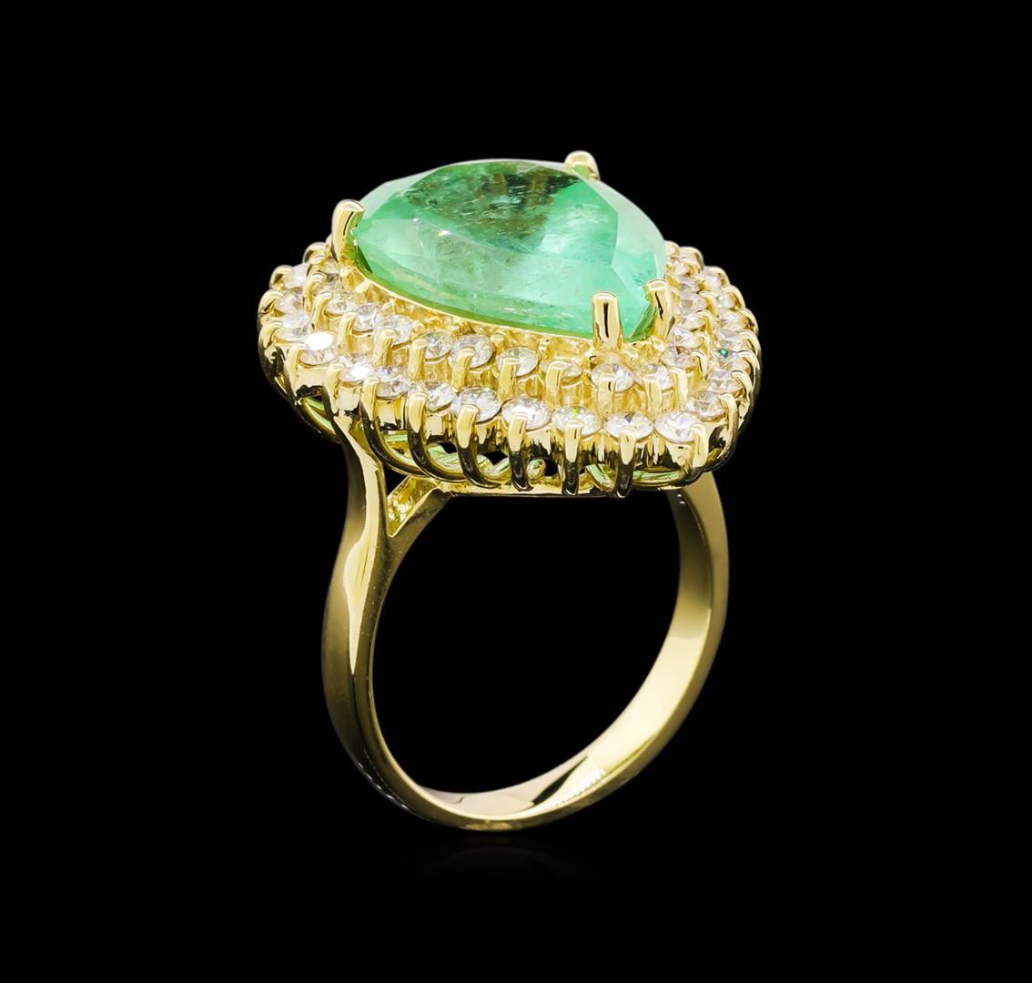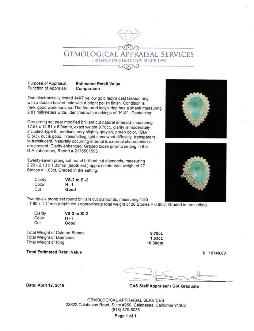 One electronically tested 14KT yellow gold lady's cast fashion ring with a double basket halo with a bright polish finish. The featured lady's ring has a shank measuring 2.81 millimeters wide. Identified with markings of "K14". Condition is new, good workmanship. Containing: One prong set pear modified brilliant cut natural emerald, measuring 17.53 x 12.81 x 8.94mm, exact weight 9.78ct., clarity is moderately included, type III, medium, very slightly grayish, green color, (GIA G 5/3), cut is good. Transmitting light somewhat diffusely, transparent to translucent. Naturally occurring internal & external characteristics are present. Clarity enhanced. Graded loose prior to setting in the GIA Laboratory, Report # 2175501595.Twenty-Seven prong set round brilliant cut diamonds, measuring 2.20 - 2.10 x 1.33mm (depth est.) approximate total weight of 27 Stones = 1.03ct. Graded in the setting. Clarity: VS-2 to SI-2. Color: H - I. Cut Good Twenty-Six prong set round brilliant cut diamonds, measuring 1.90 - 1.80 x 1.11mm (depth est.) approximate total weight of 26 Stones = 0.60ct. Graded in the setting. Clarity: VS-2 to SI-2. Color: H - I. Cut Good. Total Weight of Colored Stones 9.78ct. Total Weight of Diamonds 1.63ct. Total Weight of Ring 10.90gm. GAS Appraised at $15,740.00.