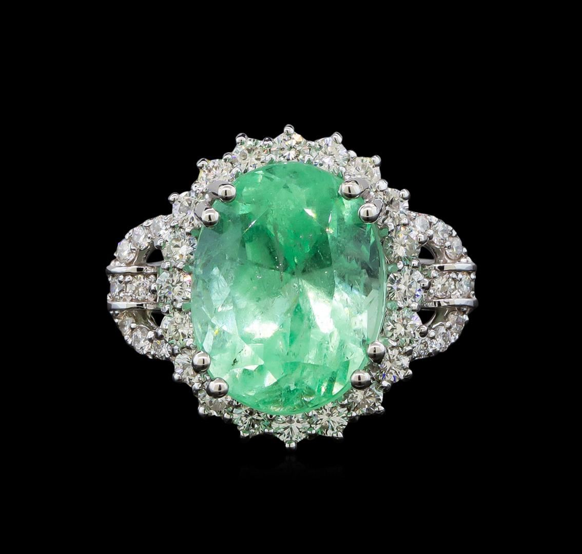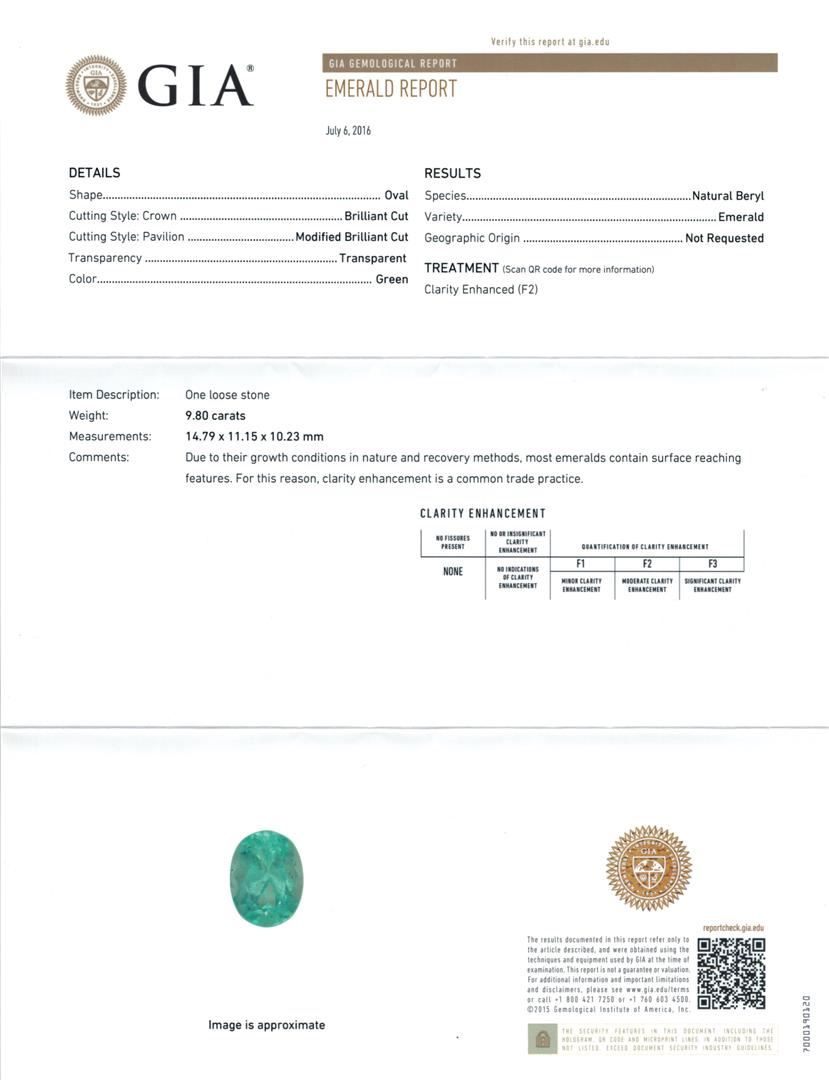 One electronically tested 14KT white gold lady's cast fashion ring with a basket halo with a bright polish finish. The featured lady's ring has a shank measuring 3.64 millimeters wide. Identified with markings of 'K14'. Condition is new, good workmanship. Containing: One prong set oval modified brilliant cut natural emerald, measuring 14.79 x 11.15 x 10.23mm, (depth est.) approximate weight of 9.80ct., clarity is moderately included, medium light, moderately strong, green color, (GIA G 4/4), cut is good. Transmitting light somewhat diffusely, transparent to translucent. Naturally occurring internal & external characteristics are present. Indications of oil residue. Colored gemstones are presumed to have been subjected to commonly used enhancement processes. Graded loose prior to setting in the GIA Laboratory, Report #5172665131. Twenty prong set round brilliant cut diamonds, measuring 2.30 - 2.20 x 1.40mm (depth est.) approximate total weight of 20 Stones = 0.89ct. Graded in the setting. Clarity SI-1 to I-1. Color: H - I Cut Good Twenty-Eight prong set round brilliant cut diamonds, measuring 1.60 - 1.50 x 0.96mm (depth est.) approximate total weight of 28 Stones = 0.39ct. Graded in the setting. Clarity SI-1 to I-1. Color: G Cut Good. Total Weight of Colored Stones 9.80ct.. Total Weight of Diamonds 1.28ct.. Total Weight of Ring 9.20gm. GAS Appraised at $18,390.00.
