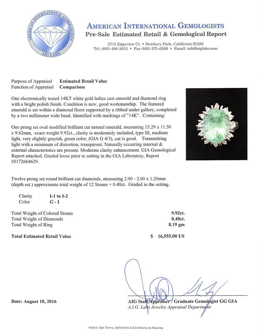 One electronically tested 14KT white gold ladies cast emerald and diamond ring with a bright polish finish. The featured emerald is set within a diamond floret supported by a ribbed under gallery, completed by a two millimeter wide band. Identified with markings of '14K'. Condition is new, good workmanship. Containing: One prong set oval modified brilliant cut natural emerald, measuring 15.29 x 11.50 x 9.62mm, exact weight 9.92ct., clarity is moderately included, type III, medium light, very slightly grayish, green color, (GIA G 4/3), cut is good. Transmitting light with a minimum of distortion, transparent. Naturally occurring internal & external characteristics are present. Moderate clarity enhancement. GIA Gemological Report attached. Graded loose prior to setting in the GIA Laboratory, Report #5172664629. Twelve prong set round brilliant cut diamonds, measuring 2.00 - 2.00 x 1.20mm (depth est.) approximate total weight of 12 Stones = 0.40ct. Graded in the setting. Clarity I-1 to I-2. Color: G - I. Total Weight of Colored Stones 9.92ct.. Total Weight of Diamonds 0.40ct.. Total Weight of Ring 8.19gm. AIG Appraised at $16,555.00.