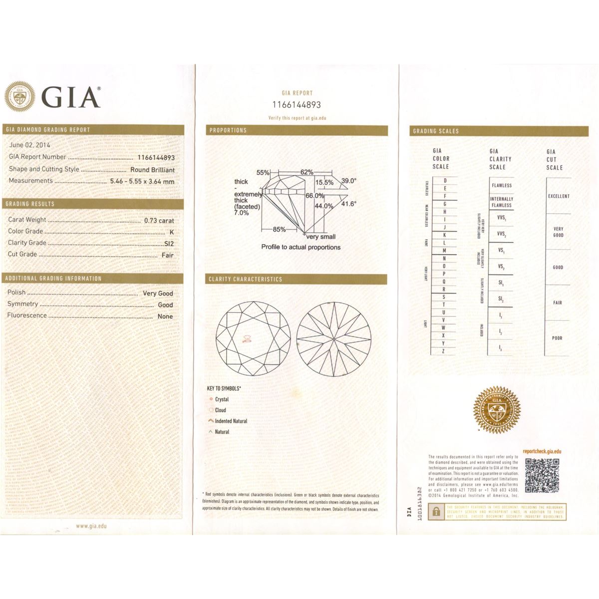 One Shape and cutting style: Round brilliant. Measurements: 5.46 x 5.55 x 3.64 mm. Carat weight: 0.73 carat. Color grade: K. Clarity grade: SI2. Cut grade: Fair. Polish: Very Good. Symmetry: Good. Fluorescence: None. GIA Report #1166144893. GIA Appraised.