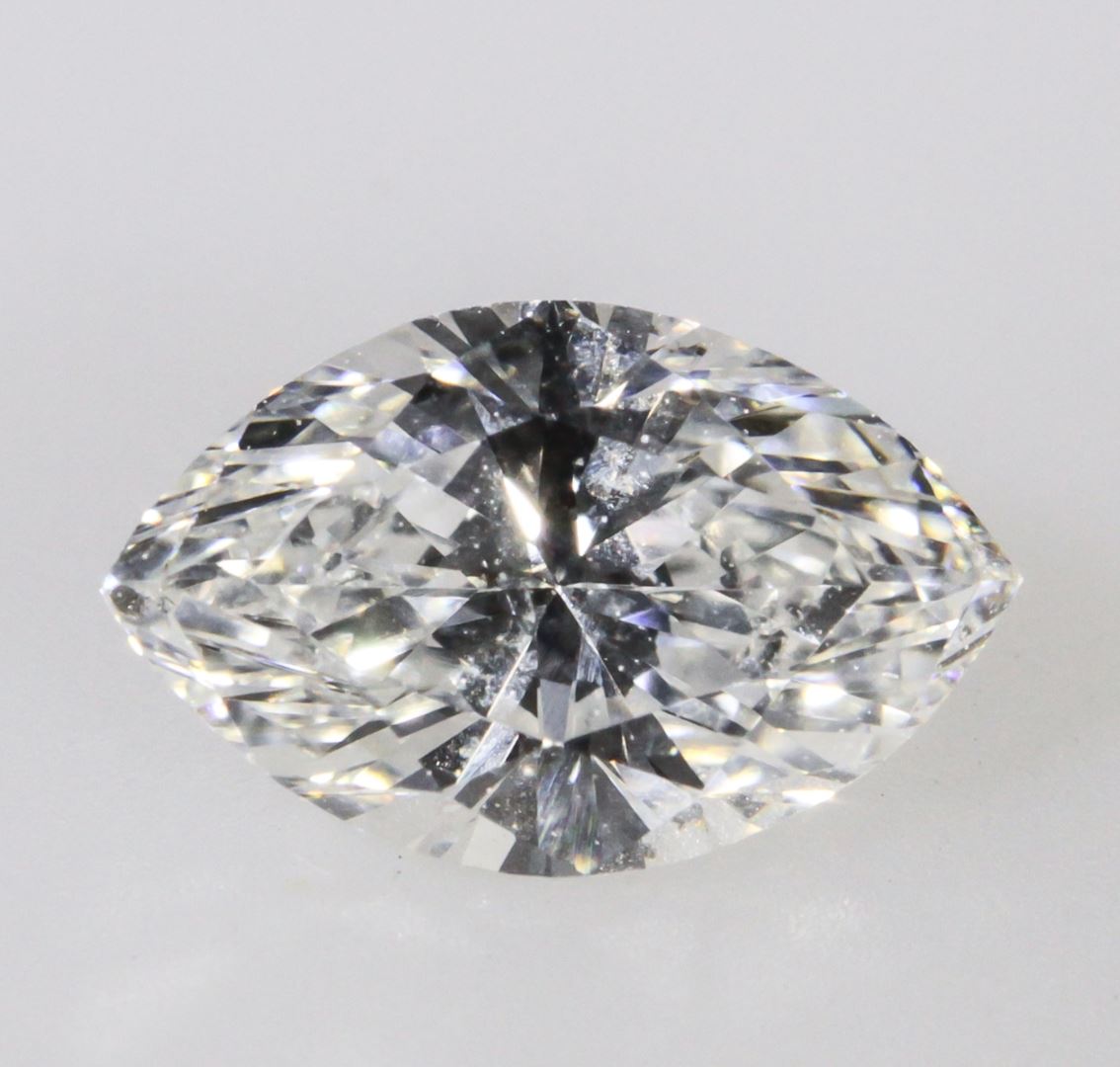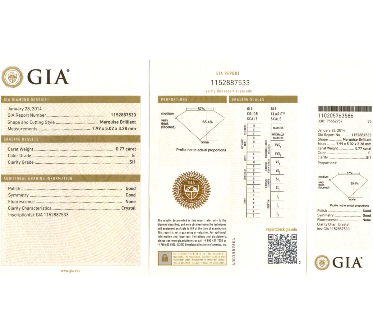 One Shape and cutting style: Marquise brilliant. Measurements: 7.99 X 5.02 x 3.28 mm. Carat weight: 0.77 carat. Color grade: E. Clarity grade: SI1. Polish: Good. Symmetry: Good. Fluorescence: None. Clarity characteristics: Crystal. GIA Report #1152887533. GIA Appraised.