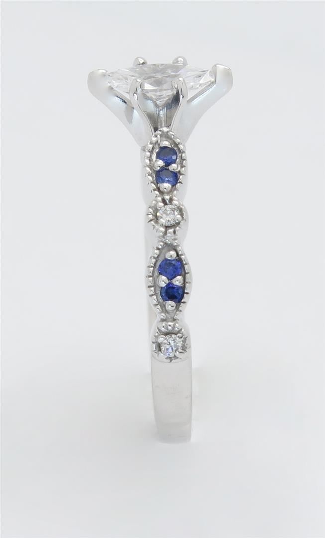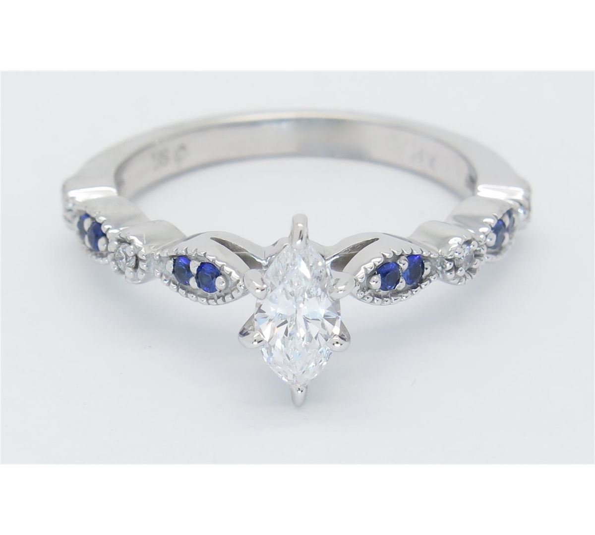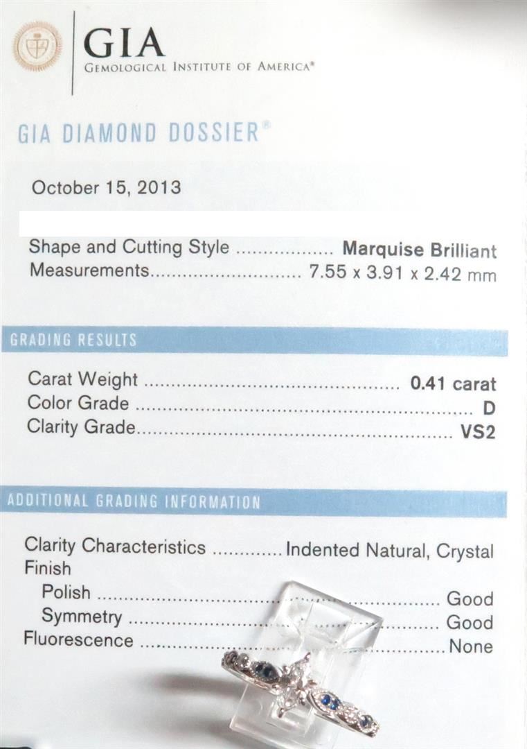 One tested 14K white gold certified diamond ring. Condition is new. Containing: one GIA Certified prong set Marquise Cut Diamond. Size: .41CT. Clarity: VS2, Color: D. 4 Round Brilliant Cut Diamonds, 8 Round Blue Sapphires. Total diamond weight: .45CTW. Diamonds are graded in the mounting, unless otherwise stated. Weight of ring: 3.6 grams. Size: 7.0. GIA Appraised.