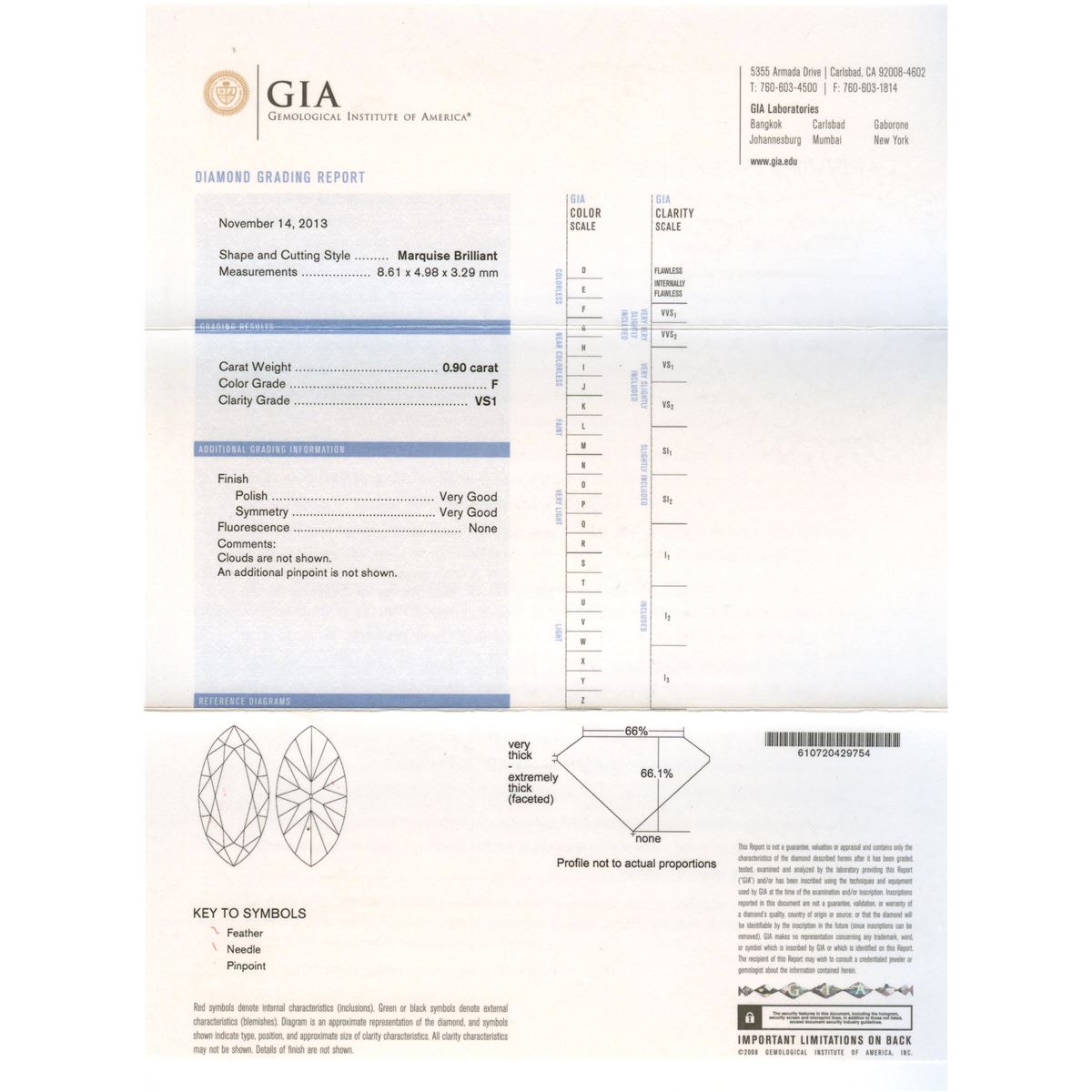 One Shape and cutting style: Marquise brilliant. Measurements: 8.61 x 4.98 x 3.29 mm. Carat weight: 0.90 carat. Color grade: F. Clarity grade: VS1. Polish: Very good. Symmetry: Very good. Fluorescence: None. GIA Report #2151772792. GIA Appraised.