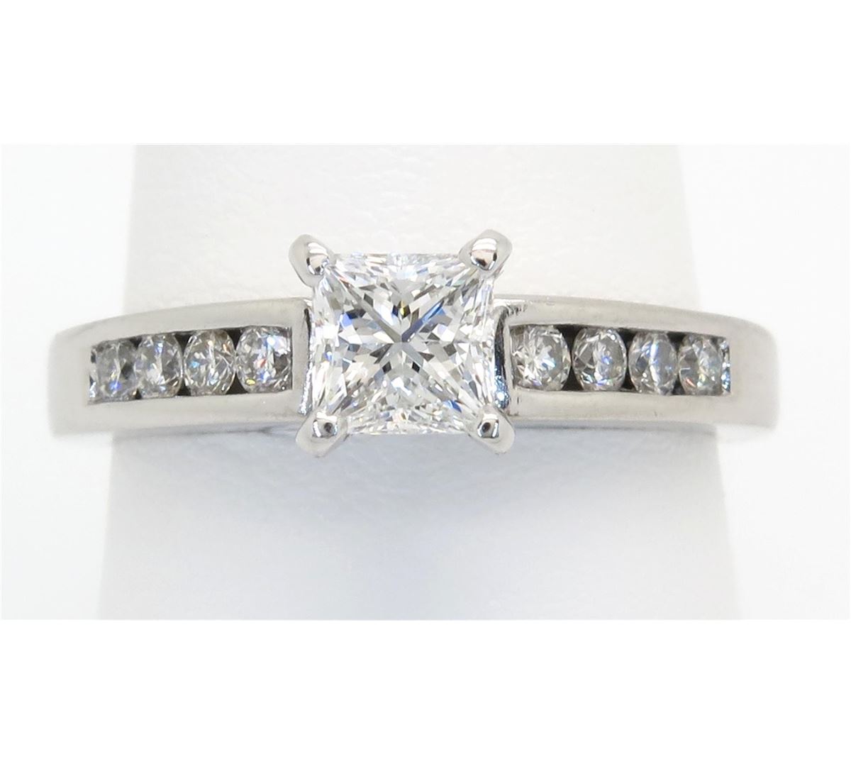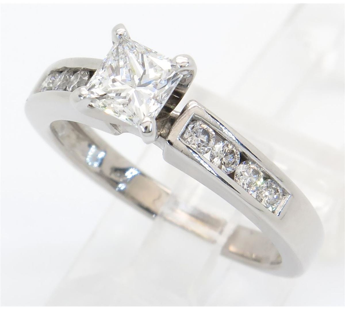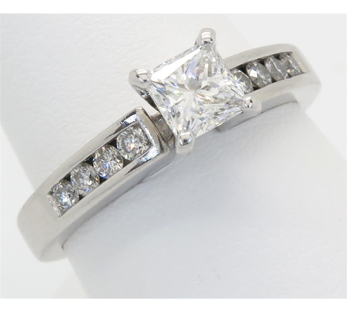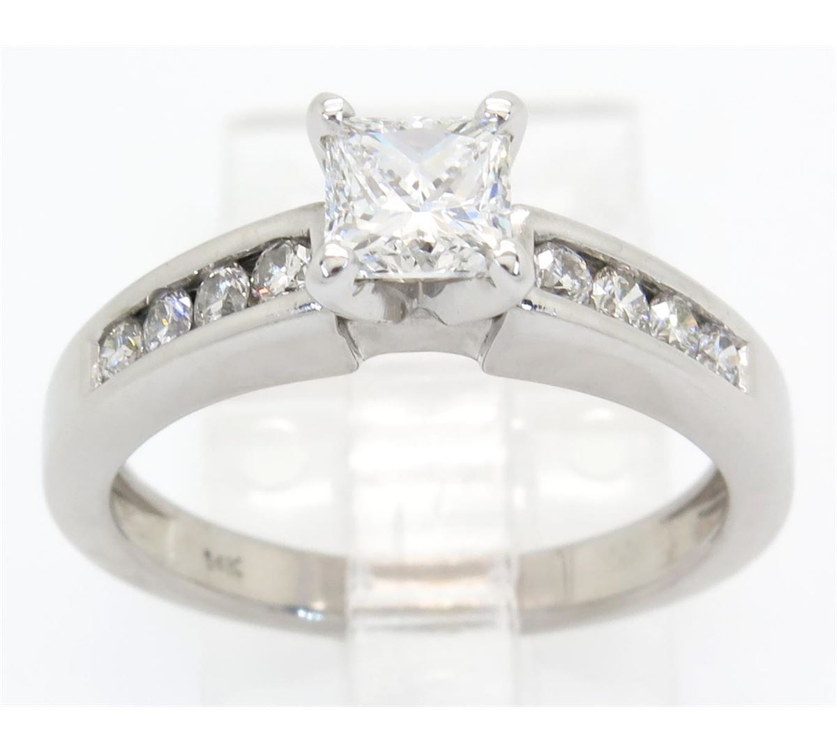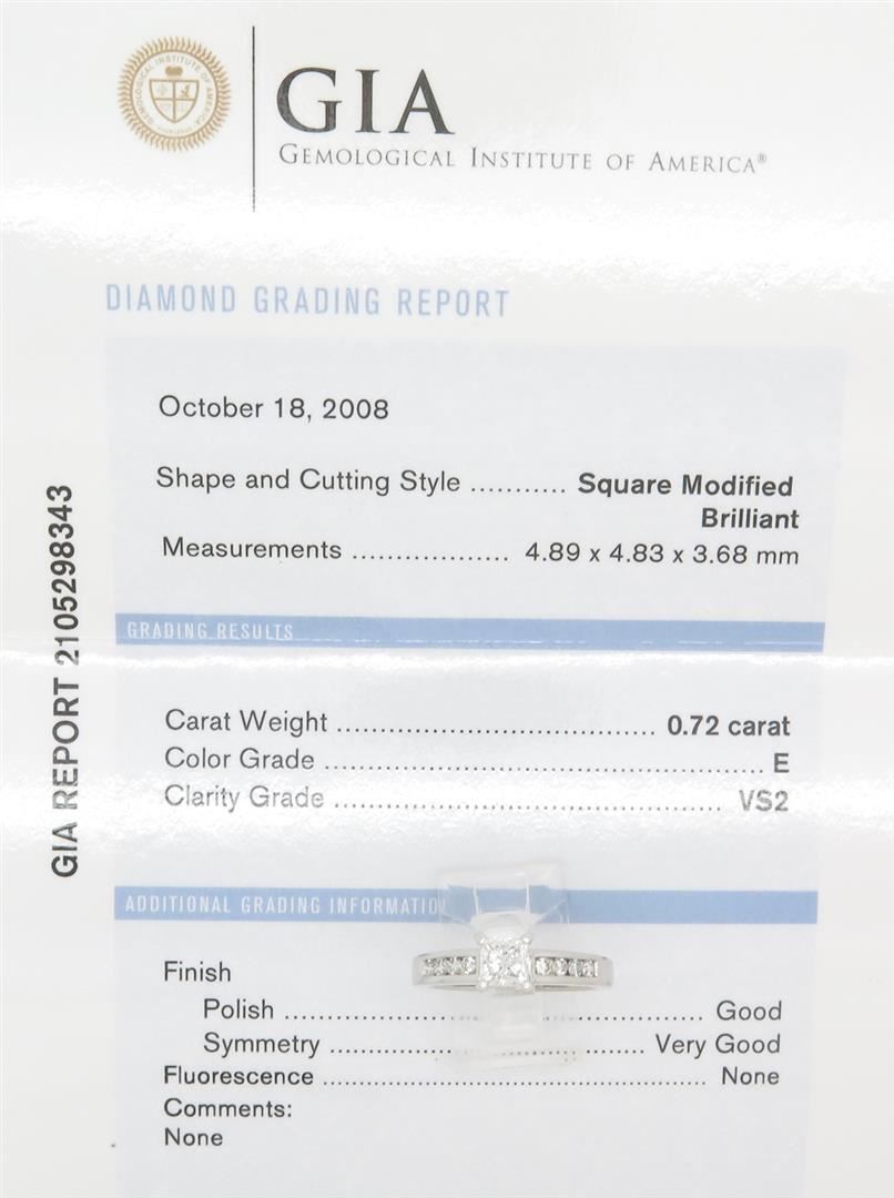 One tested 14K white gold diamond ring. Containing: One prong set GIA Certified Princess Cut Diamond, Size: .72CT, Clarity: VS2, Color: E. 8 Round Brilliant Cut Diamonds. Approximate total diamond weight: 1.00CTW. All diamonds are graded in the mounting unless otherwise stated. Weight of ring: 4.2 grams, Size: 6.75. GIA Appraised.