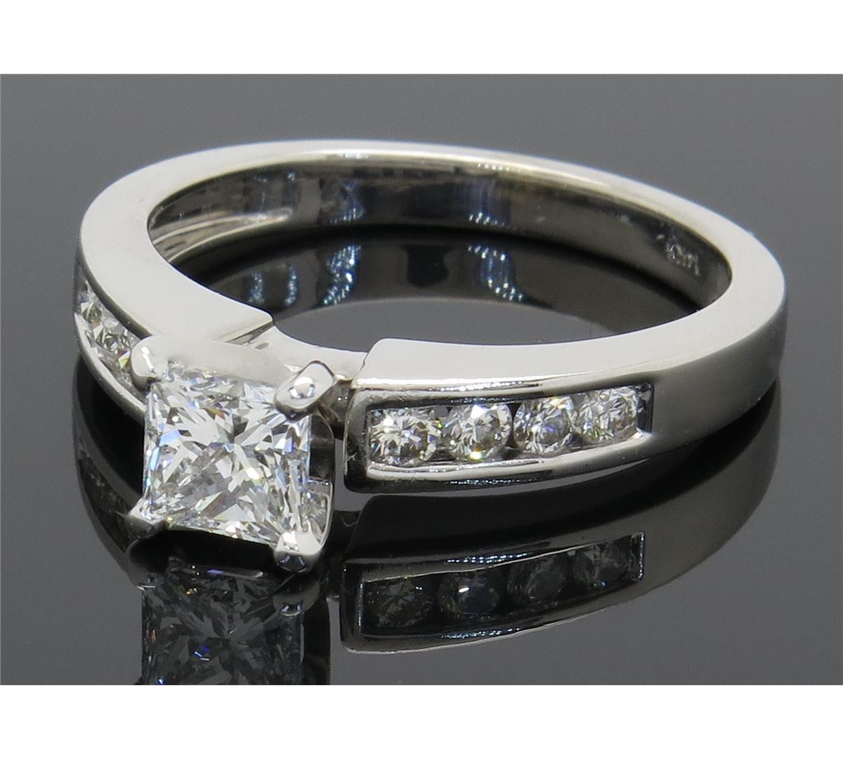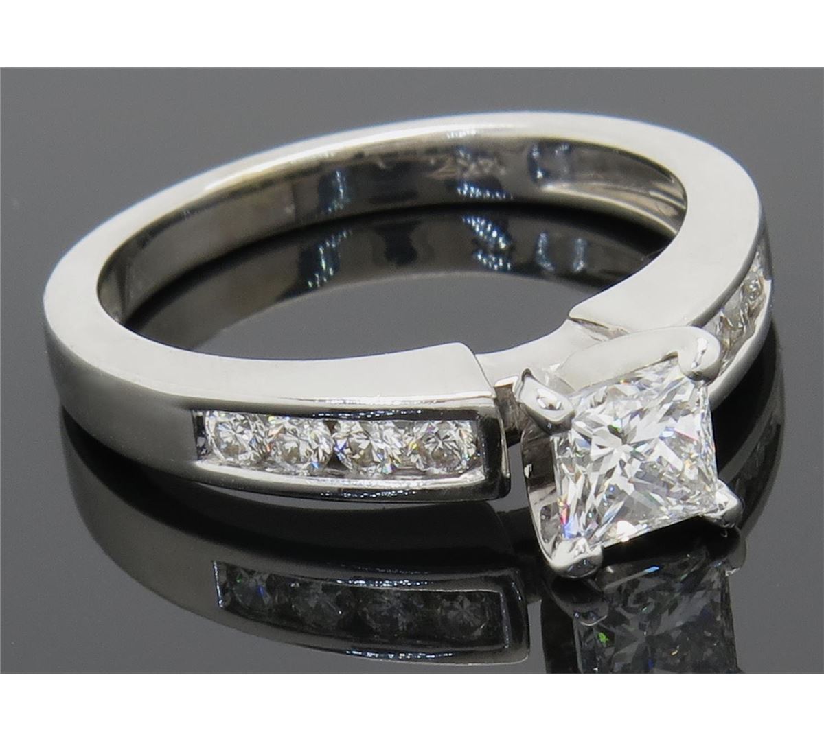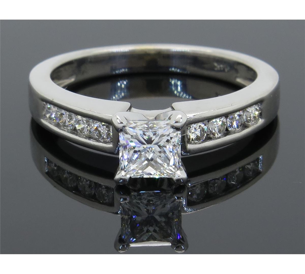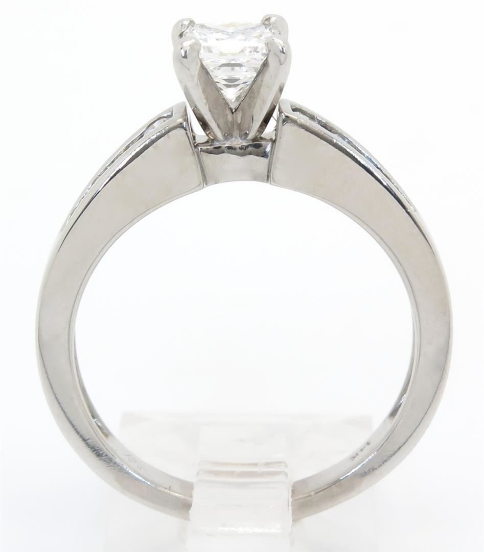 One tested 14K white gold diamond ring. Containing: One prong set GIA Certified Princess Cut Diamond, Size: .72CT, Clarity: VS2, Color: E. 8 Round Brilliant Cut Diamonds. Approximate total diamond weight: 1.00CTW. All diamonds are graded in the mounting unless otherwise stated. Weight of ring: 4.2 grams, Size: 6.75. GIA Appraised.