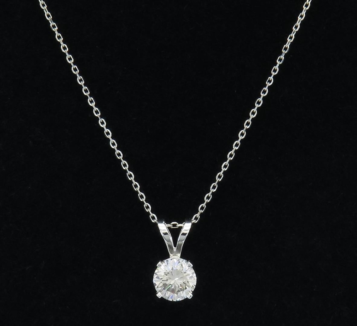 One tested 14K white gold certified diamond pendant. Containing: One GIA Certified Round Brilliant Cut Diamond. Size: 1.03CT, Clarity: SI1, Color: L. Weight of necklace: 2.1 grams. Size of chain: 16" long. GIA Appraised.