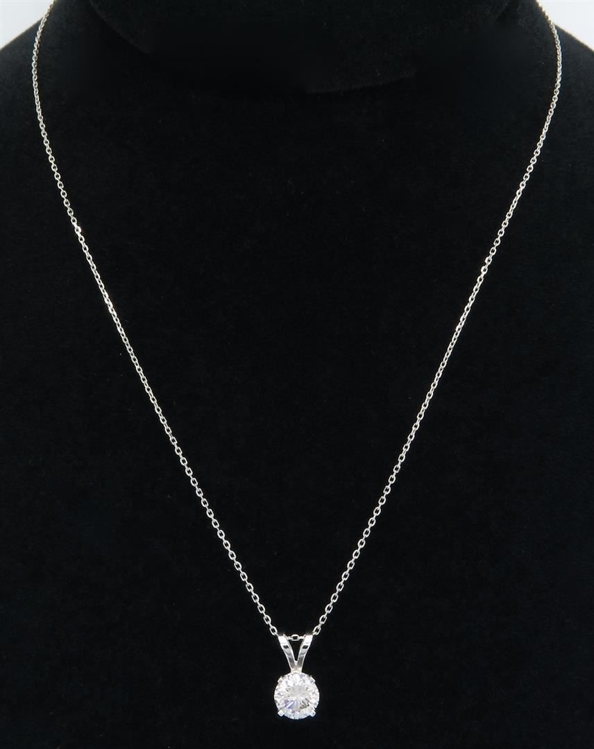 One tested 14K white gold certified diamond pendant. Containing: One GIA Certified Round Brilliant Cut Diamond. Size: 1.03CT, Clarity: SI1, Color: L. Weight of necklace: 2.1 grams. Size of chain: 16" long. GIA Appraised.