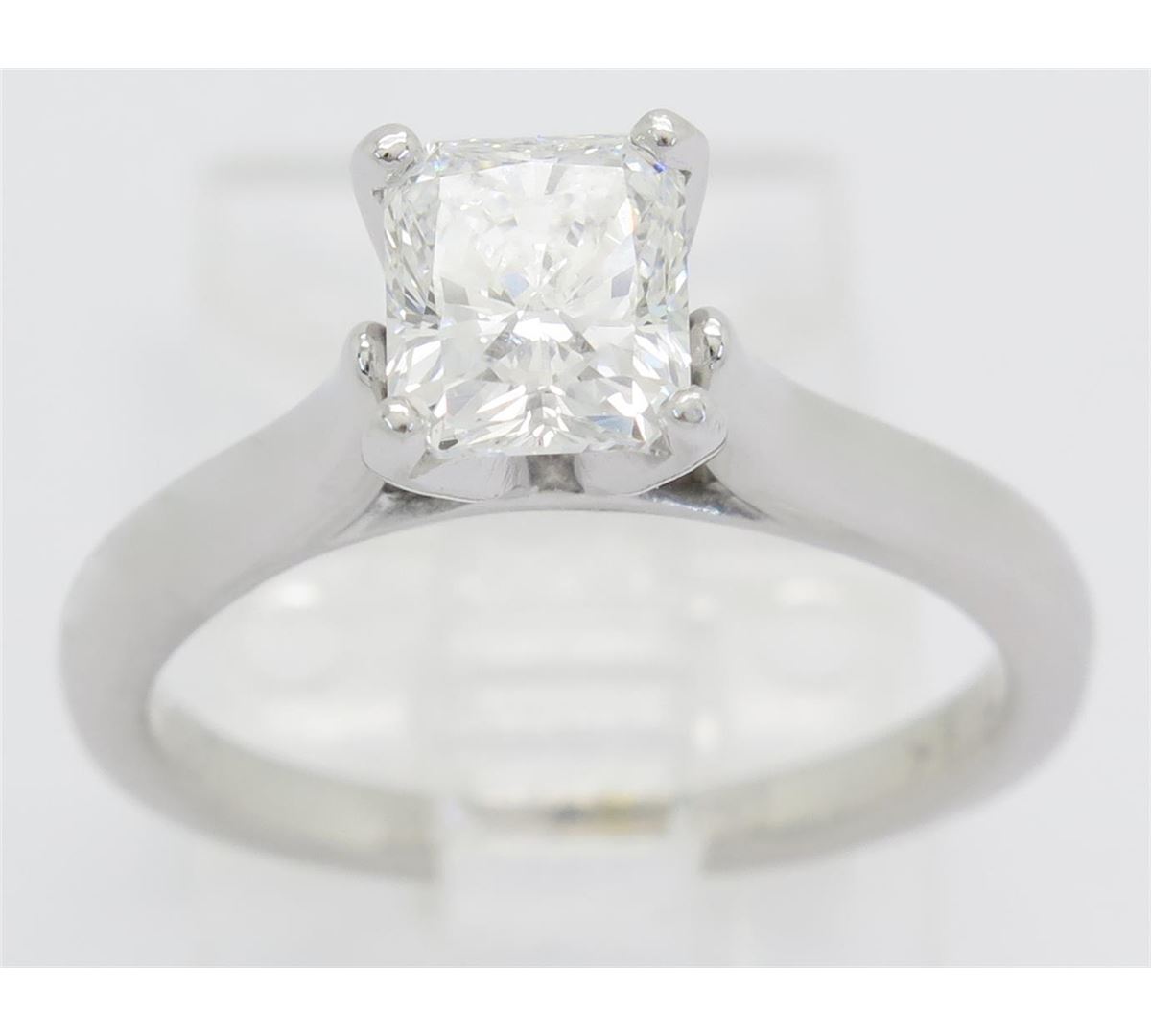 One tested 18K white gold certified diamond ring. Containing: One GIA Certified Radiant Cut Diamond. Size: 1.04CT, Clarity: VS2, Color: F. Weight of ring: 4.0 grams. Size: 5.0. GIA Appraised.
