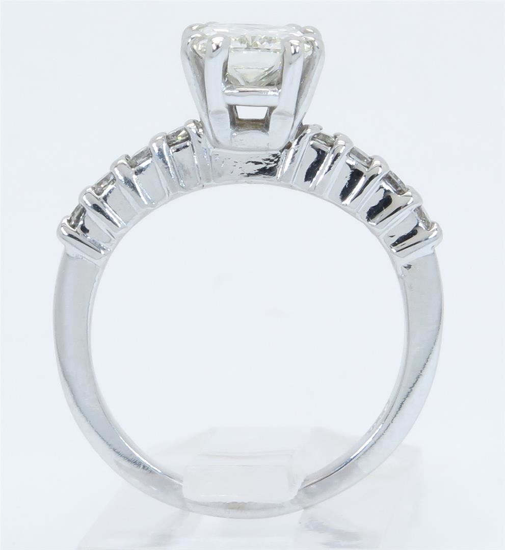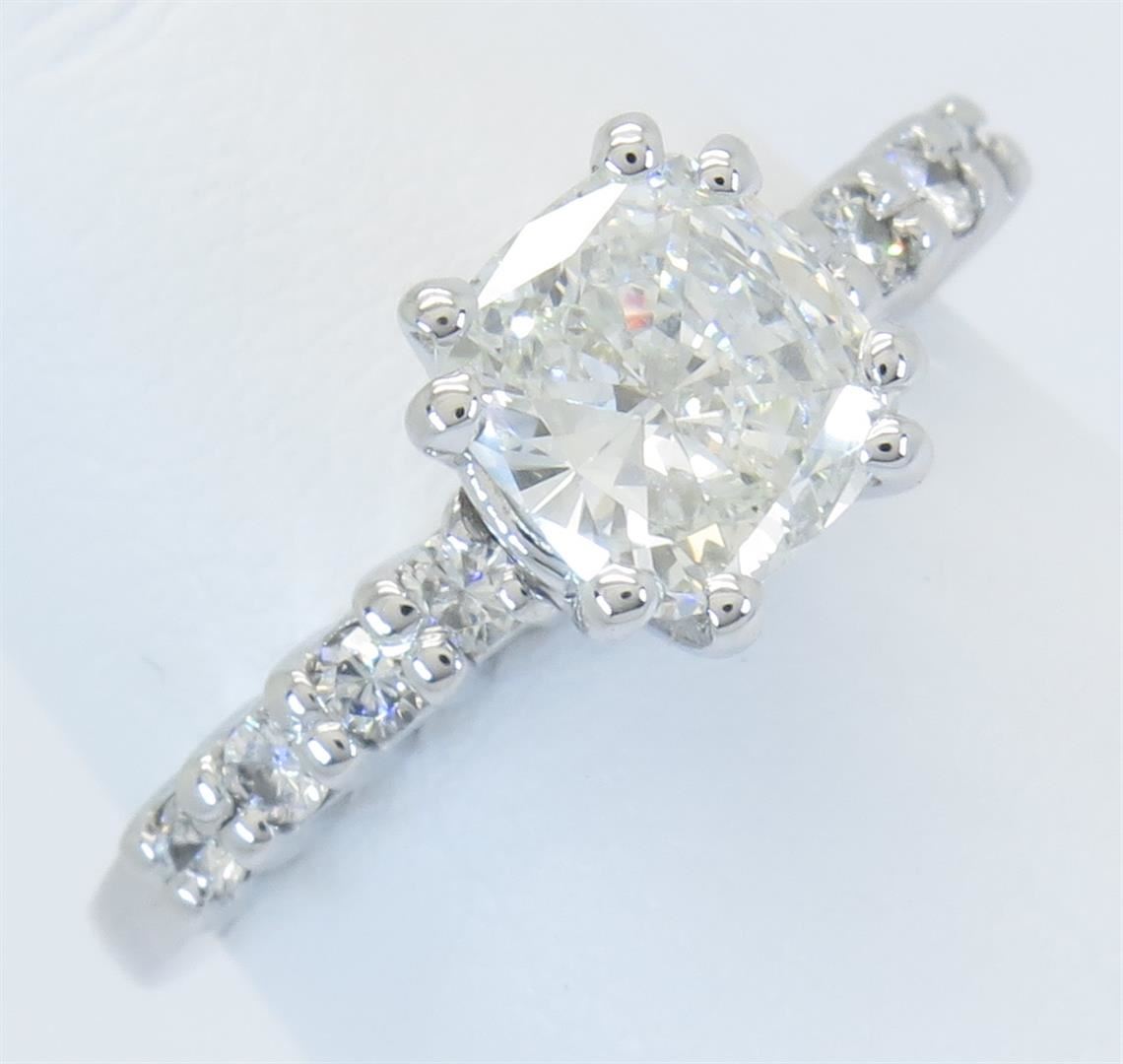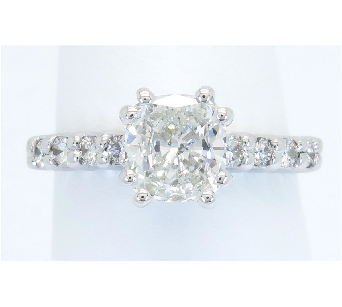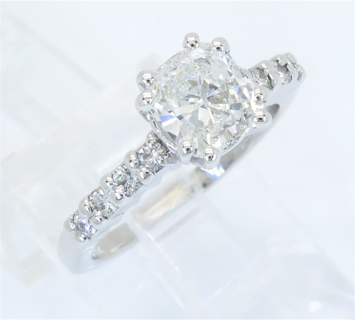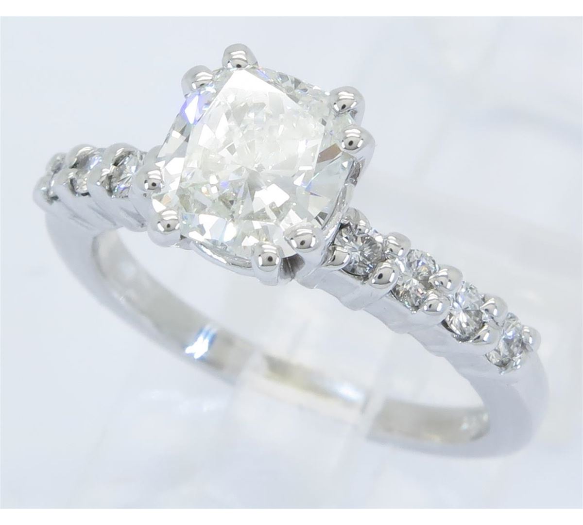 One tested 14K white gold diamond ring. Containing: One prong set GIA Certified Cushion Cut Diamond, Size: .91CT, Clarity: VS2, Color: H. 8 Round Brilliant Cut Diamonds. Approximate total diamond weight: 1.14CTW. All diamonds are graded in the mounting unless otherwise stated. Weight of ring: 2.9 grams, Size: 4.0. GIA Appraised.