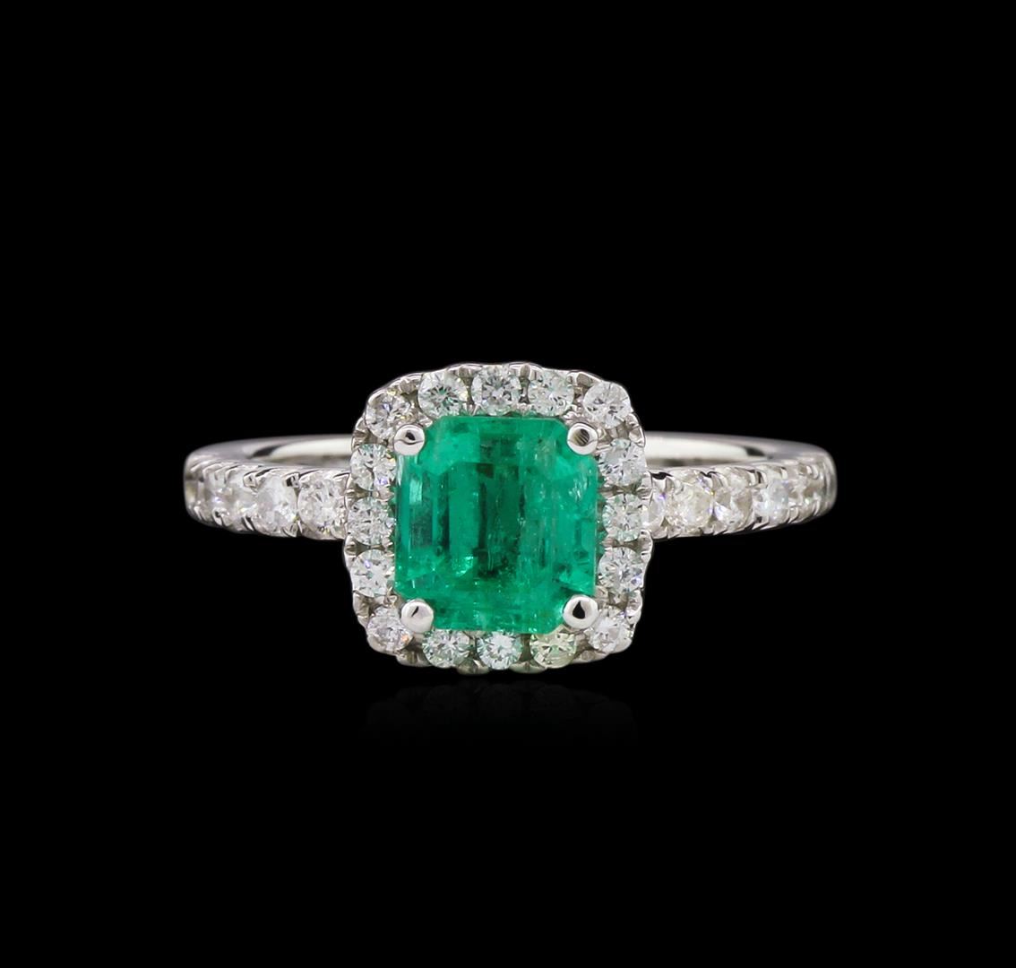 One electronically tested 14KT white gold ladies cast emerald and diamond ring with a bright polish finish. The featured emerald is set within a diamond bezel supported by an elaborate lattice under gallery and diamond set shoulders, completed by a one and one-half millimeter wide band. Identified with markings of "14K 585". Condition is good. Containing: One prong set octagonal step cut natural emerald, measuring 6.44 x 6.01 x 4.78mm, exact weight 1.32ct., clarity is moderately included, type III, medium dark, moderately strong, green color, (GIA G 6/4), cut is good. Transmitting light with a minimum of distortion, transparent. Naturally occurring internal & external characteristics are present. Clarity enhanced. Geographic origin is Columbia. GIA Gemological Report attached. Graded loose prior to setting in the GIA Laboratory, Report #1172341295.Fourteen prong set round brilliant cut diamonds, measuring 1.80 - 1.70 x 1.05mm (depth est.) approximate total weight of 14 Stones = 0.30ct. Graded in the setting. Clarity: SI-2 to I-2. Color: G - I Sixteen prong set round brilliant cut diamonds, measuring 1.40 - 1.30 x 0.81mm (depth est.) approximate total weight of 16 Stones = 0.16ct. Graded in the setting. Clarity: SI-2 to I-2. Color: G - I. Total Weight of Colored Stones 1.32ct. Total Weight of Diamonds 0.46ct. Total Weight of Ring 3.59gm. AIG Appraised at $5,360.00.