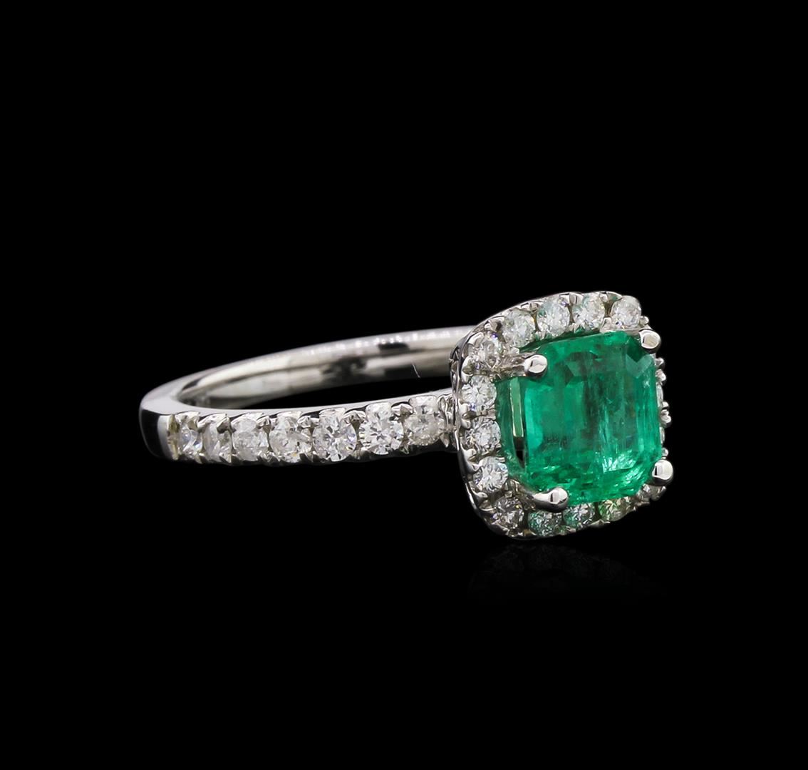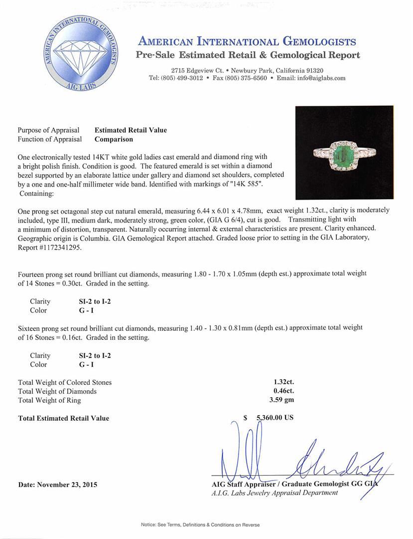 One electronically tested 14KT white gold ladies cast emerald and diamond ring with a bright polish finish. The featured emerald is set within a diamond bezel supported by an elaborate lattice under gallery and diamond set shoulders, completed by a one and one-half millimeter wide band. Identified with markings of "14K 585". Condition is good. Containing: One prong set octagonal step cut natural emerald, measuring 6.44 x 6.01 x 4.78mm, exact weight 1.32ct., clarity is moderately included, type III, medium dark, moderately strong, green color, (GIA G 6/4), cut is good. Transmitting light with a minimum of distortion, transparent. Naturally occurring internal & external characteristics are present. Clarity enhanced. Geographic origin is Columbia. GIA Gemological Report attached. Graded loose prior to setting in the GIA Laboratory, Report #1172341295.Fourteen prong set round brilliant cut diamonds, measuring 1.80 - 1.70 x 1.05mm (depth est.) approximate total weight of 14 Stones = 0.30ct. Graded in the setting. Clarity: SI-2 to I-2. Color: G - I Sixteen prong set round brilliant cut diamonds, measuring 1.40 - 1.30 x 0.81mm (depth est.) approximate total weight of 16 Stones = 0.16ct. Graded in the setting. Clarity: SI-2 to I-2. Color: G - I. Total Weight of Colored Stones 1.32ct. Total Weight of Diamonds 0.46ct. Total Weight of Ring 3.59gm. AIG Appraised at $5,360.00.