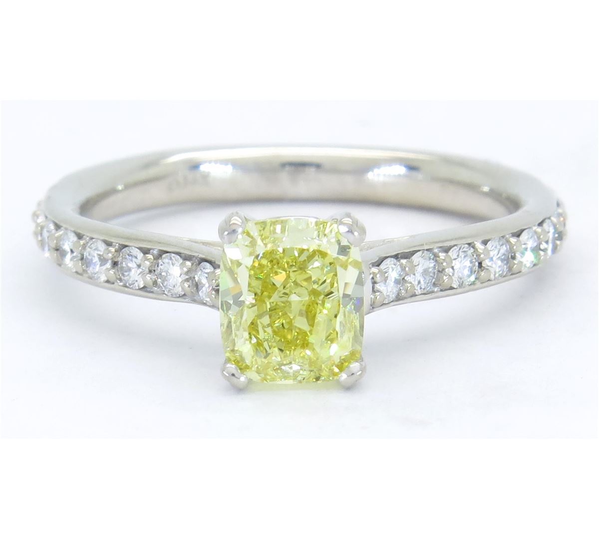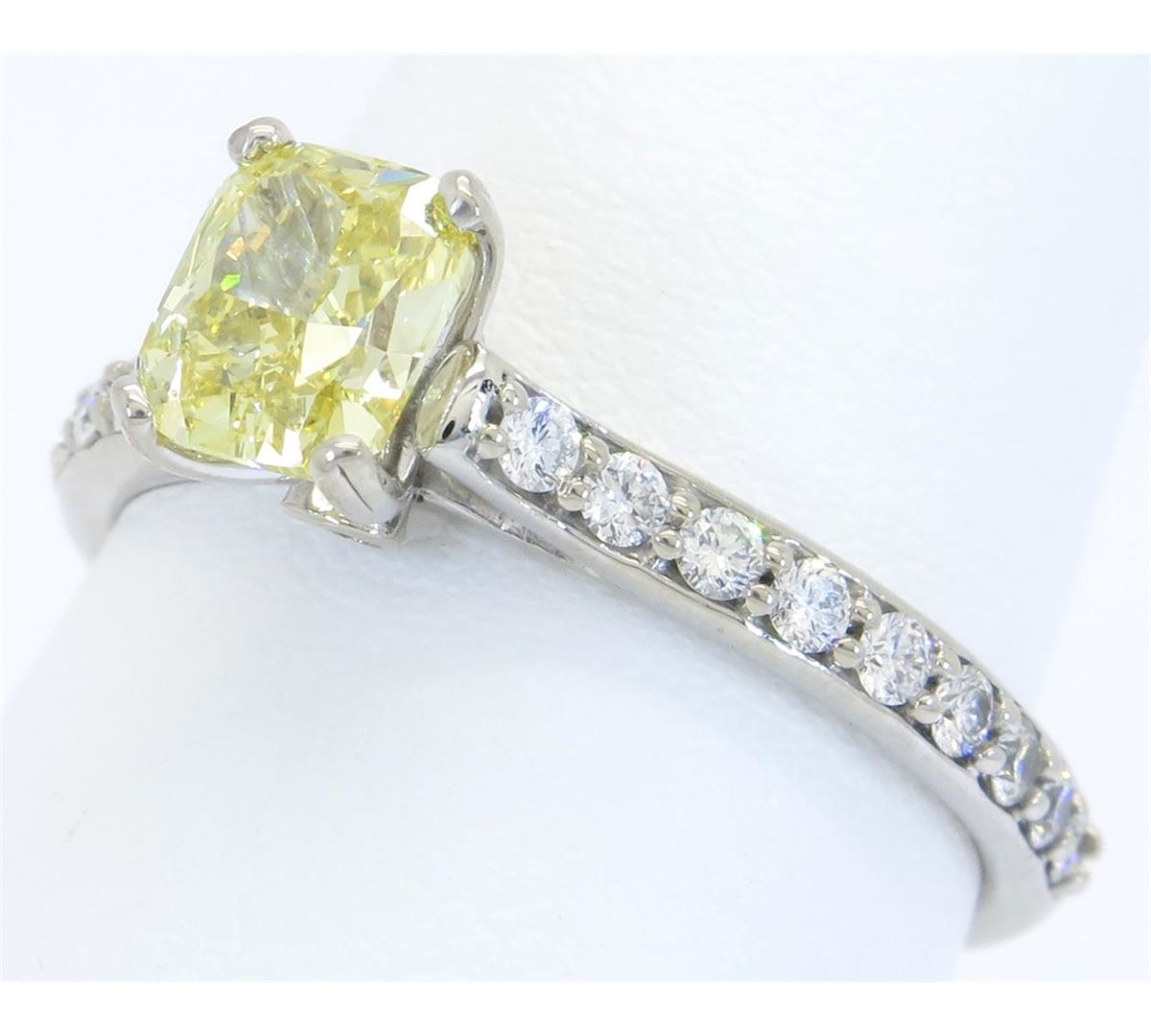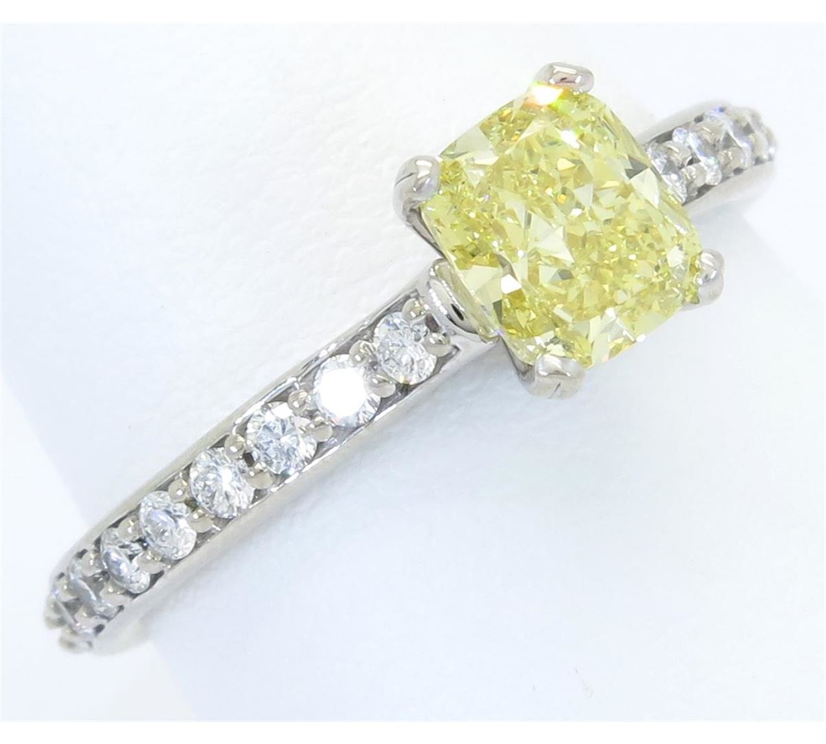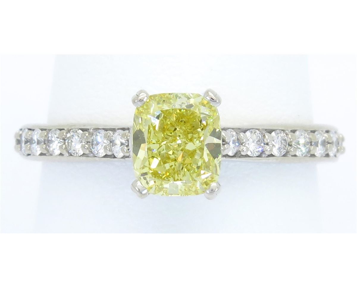 One tested 14K white gold diamond ring. Containing: 1 GIA Certified Cushion Cut Diamond, Size: 1.02CT, Clarity: VS1, Color: Natural Fancy Intense Yellow. 20 Round Brilliant Cut Diamonds. Approximate total diamond weight: 1.37CTW. All diamonds are graded in the mounting unless otherwise stated. Weight of ring: 3.3 grams, Size: 7.0. GIA Appraised.