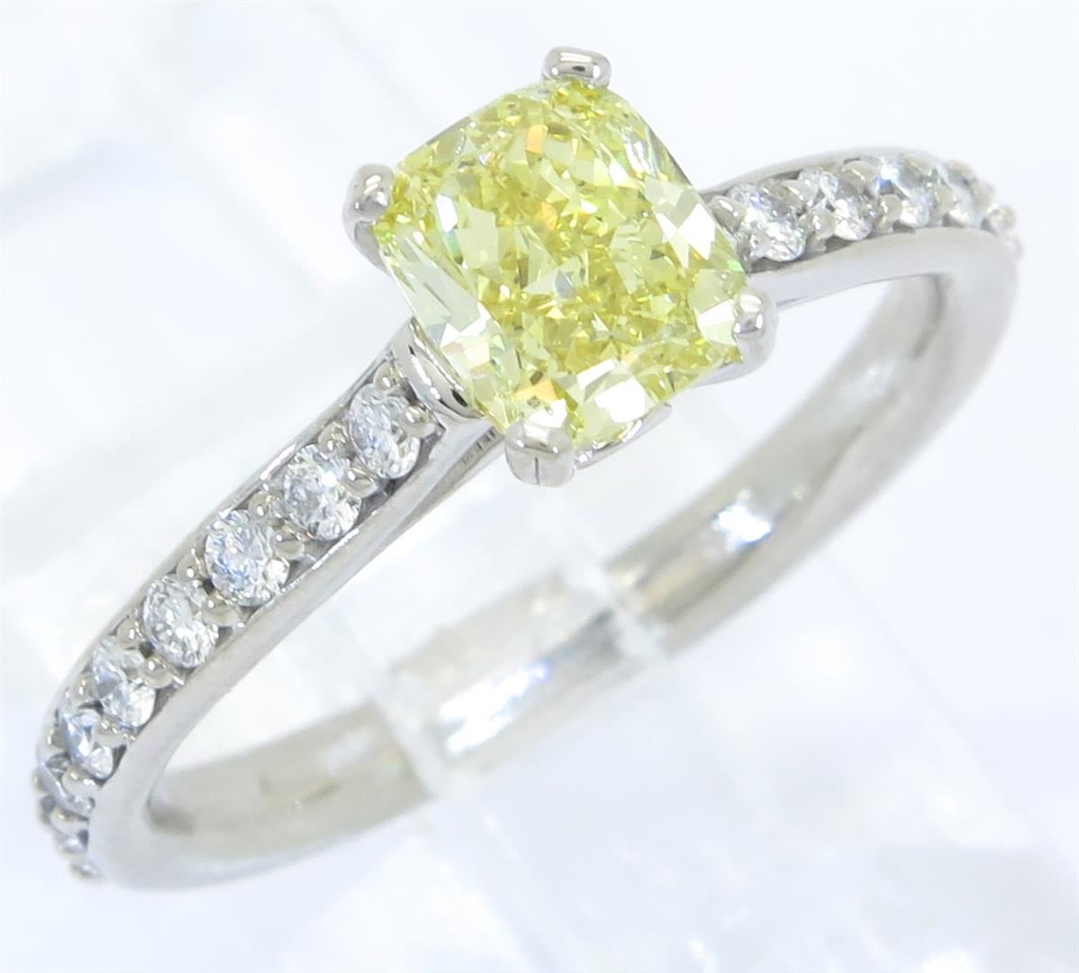 One tested 14K white gold diamond ring. Containing: 1 GIA Certified Cushion Cut Diamond, Size: 1.02CT, Clarity: VS1, Color: Natural Fancy Intense Yellow. 20 Round Brilliant Cut Diamonds. Approximate total diamond weight: 1.37CTW. All diamonds are graded in the mounting unless otherwise stated. Weight of ring: 3.3 grams, Size: 7.0. GIA Appraised.