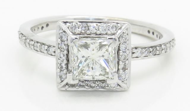 One tested 14K white gold certified diamond ring. Containing: One GIA Certified Princess Cut Diamond. Clarity: VVS2, Color: K. 48 Round Brilliant Cut Diamonds. Approximate Total diamond weight: 1.39CTW. Diamonds are graded in the mounting, unless otherwise stated. Weight of ring: 3.2 grams. Size: 6.0. GIA Appraised.