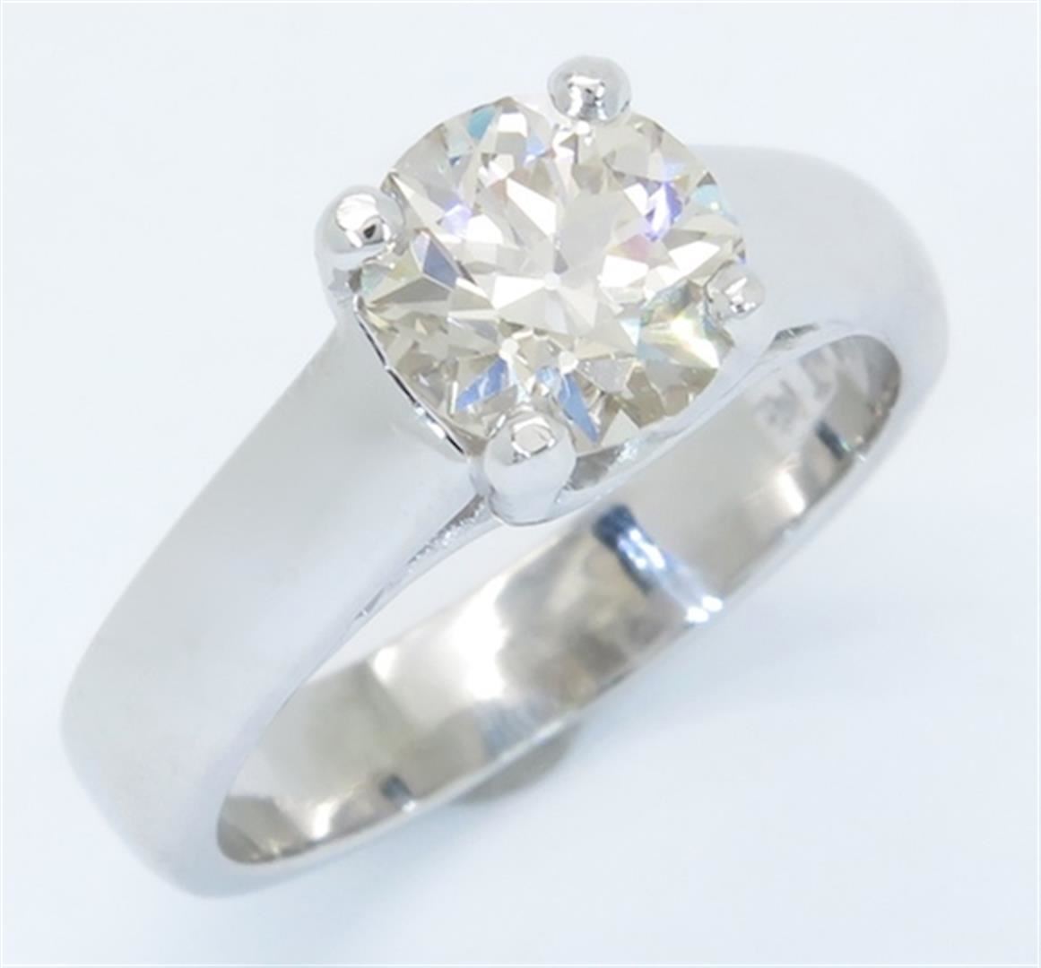 One tested platinum diamond ring. Containing: One GIA Certified Old European Cut Diamond. Size: 1.41CT, Clarity: VS1, Color: O-P. Diamonds are graded in the mounting, unless otherwise stated. Weight: 8.3 grams, Size: 6.0. GIA Appraised.