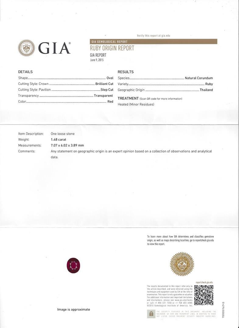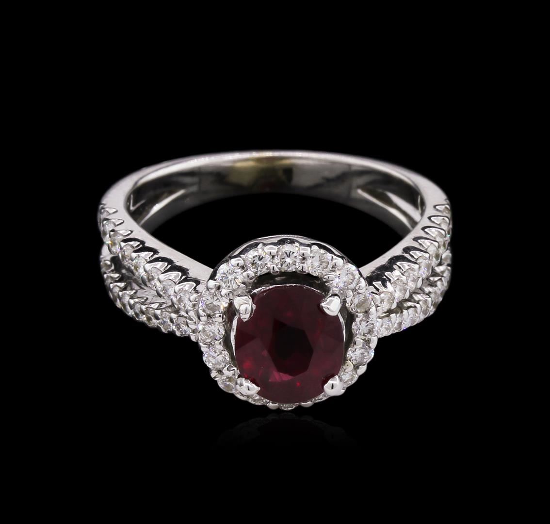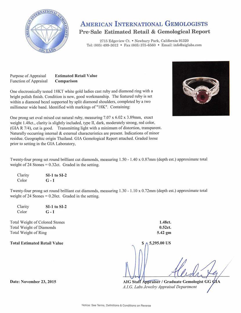 One electronically tested 18KT white gold ladies cast ruby and diamond ring with a bright polish finish. The featured ruby is set within a diamond bezel supported by split diamond shoulders, completed by a two millimeter wide band. Identified with markings of "18K". Condition is new, good workmanship. Containing: One prong set oval mixed cut natural ruby, measuring 7.07 x 6.02 x 3.89mm, exact weight 1.48ct., clarity is slightly included, type II, dark, moderately strong, red color, (GIA R 7/4), cut is good. Transmitting light with a minimum of distortion, transparent. Naturally occurring internal & external characteristics are present. Indications of minor residue. Geographic origin Thailand. GIA Gemological Report attached. Graded loose prior to setting in the GIA Laboratory, Report #5171186822.Twenty-Four prong set round brilliant cut diamonds, measuring 1.50 - 1.40 x 0.87mm (depth est.) approximate total weight of 24 Stones = 0.32ct. Graded in the setting. Clarity: SI-1 to SI-2. Color: G - I Twenty-Four prong set round brilliant cut diamonds, measuring 1.30 - 1.10 x 0.72mm (depth est.) approximate total weight of 24 Stones = 0.20ct. Graded in the setting. Clarity: SI-1 to SI-2. Color: G - I. Total Weight of Colored Stones 1.48ct. Total Weight of Diamonds 0.52ct. Total Weight of Ring 5.42gm. AIG Appraised at $5,295.00.