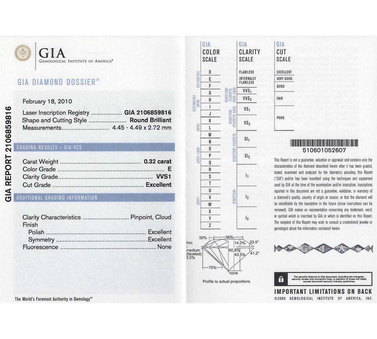 One electronically tested 14KT white gold ladies cast diamond wedding band with a bright polish finish. Identified with markings of "14K". Condition is new. Containing: One channel set round brilliant cut diamond, measuring 4.48 - 4.45 x 2.76mm (depth est.) exact weight 0.33ct. Clarity: VVS-1. Color: E, Cut is Excellent. GIA Gem Trade Laboratory Report # 1156670587. One channel set round brilliant cut diamond, measuring 4.41 - 4.45 x 2.75mm (depth est.) exact weight 0.32ct. Clarity: VVS-1. Color: E, Cut is Excellent. GIA Gem Trade Laboratory Report #511929565. One channel set round brilliant cut diamond, measuring 4.49 - 4.43 x 2.74mm (depth est.) exact weight 0.33ct. Clarity: VVS-1. Color: E, Cut is Excellent. GIA Gem Trade Laboratory Report #6147370363. One channel set round brilliant cut diamond, measuring 4.49 - 4.45 x 2.72mm (depth est.) exact weight 0.32ct. Clarity: VVS-1. Color: E, Cut is Excellent. GIA Gem Trade Laboratory Report #21068559816. One channel set round brilliant cut diamond, measuring 4.48 - 4.49 x 2.75mm (depth est.) exact weight 0.34ct. Clarity: VVS-1. Color: E, Cut is Excellent. GIA Gem Trade Laboratory Report #2146968090. Total Weight of Diamonds 1.64ct. Total Weight of Wedding Band 6.70gm. GGL Appraised at $12,065.00.
