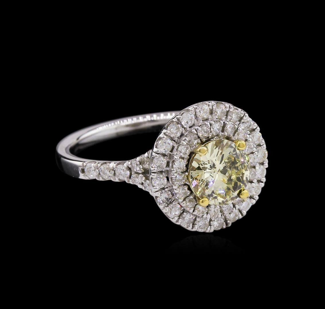 14KT White Gold 1.00ct I-1/Light Yellow GIA Cert Diamond Ring A5361. One electronically tested 14KT white gold ladies cast diamond unity ring with a bright polish finish. Condition is new, good workmanship. The featured diamond is set within a yellow gold basket and placed within tiered diamond bezels. The ring is supported by diamond set split shoulders, completed by a two millimeter wide band. Identified with markings of "14K". Containing: One prong set round brilliant cut diamond, measuring 6.57 - 6.64 x 3.66mm exact weight 1.00ct with a medium blue fluorescence. Diamond Grading Report attached. Graded loose for color prior to setting in the GIA Laboratory, Report #2145895788. Clarity I-1. Color Light Yellow. Depth 55.4%. Table 69.6%. Fifty-six prong set round brilliant cut diamonds, measuring 1.70 - 1.40 x 0.93mm (depth est.) approximate total weight of 56 Stones = 0.72ct. Graded in the setting. Clarity SI-1 to I-1. Color G -- I. Total Weight of Diamonds 1.72ct. Total Weight of Ring 4.53gm. AIG Appraised at $10,670.00.