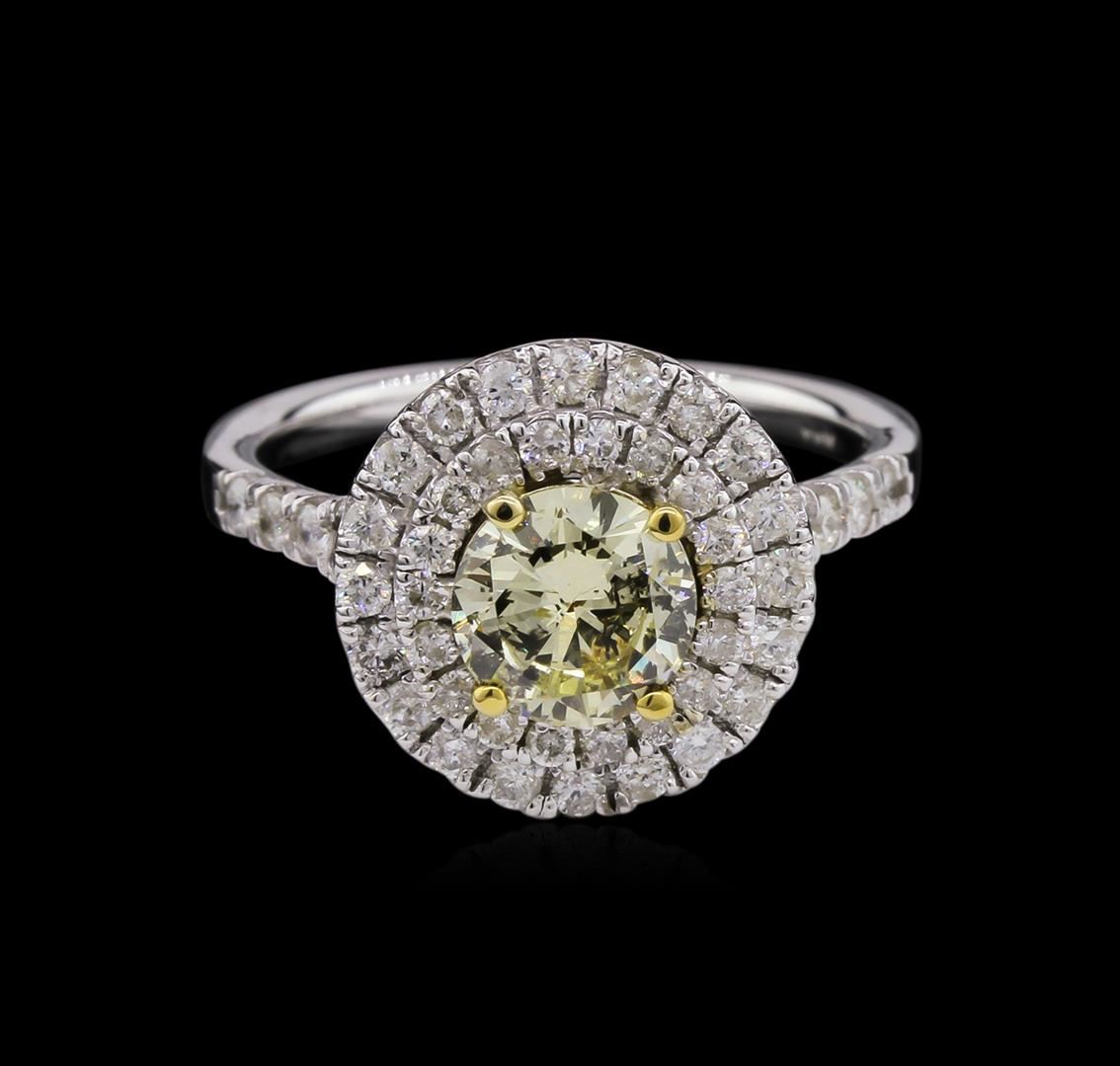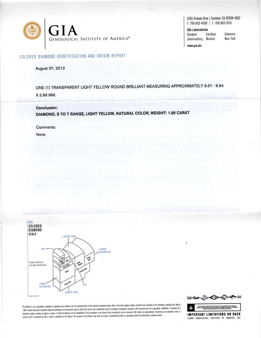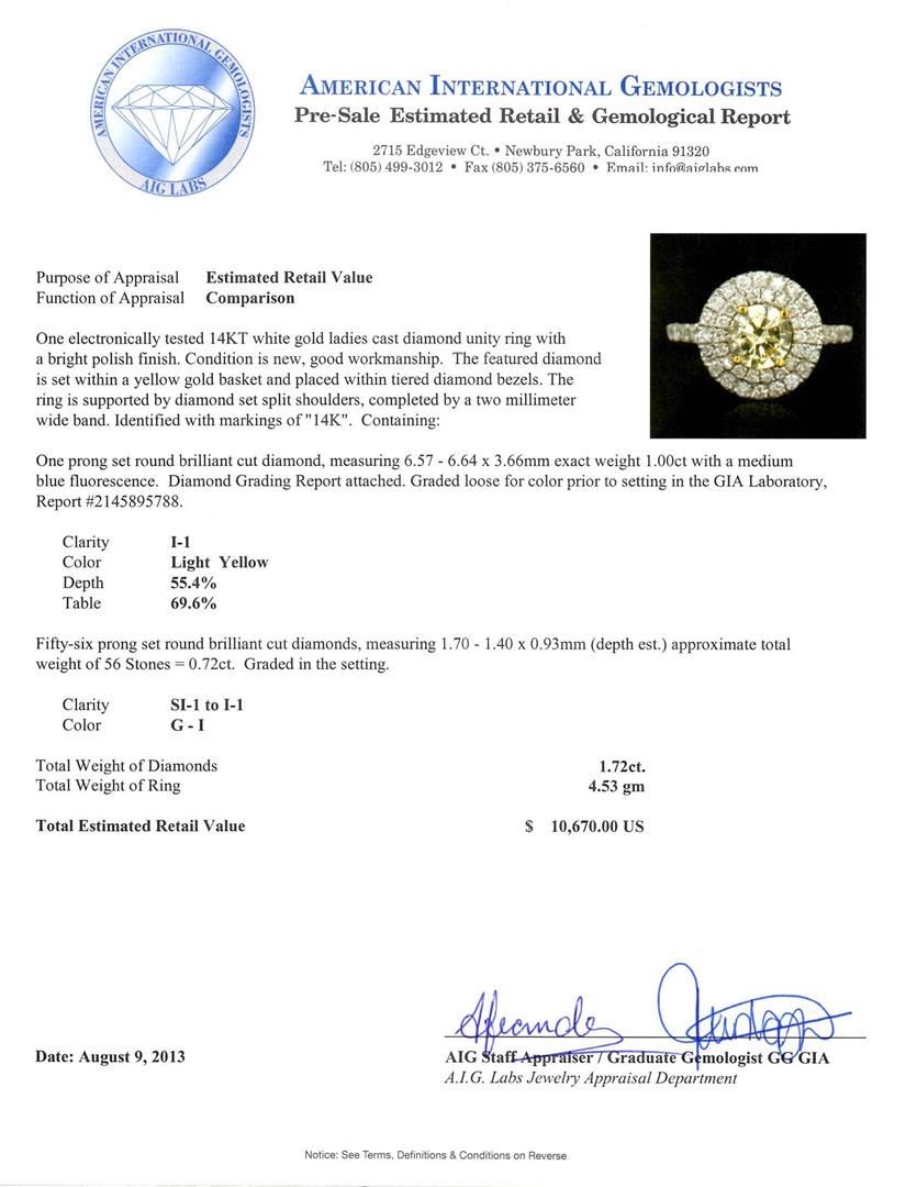One electronically tested 14KT white gold ladies cast diamond unity ring with a bright polish finish. Condition is new, good workmanship. The featured diamond is set within a yellow gold basket and placed within tiered diamond bezels. The ring is supported by diamond set split shoulders, completed by a two millimeter wide band. Identified with markings of "14K". Containing: One prong set round brilliant cut diamond, measuring 6.57 - 6.64 x 3.66mm exact weight 1.00ct with a medium blue fluorescence. Diamond Grading Report attached. Graded loose for color prior to setting in the GIA Laboratory, Report #2145895788. Clarity I-1. Color Light Yellow. Depth 55.4%. Table 69.6%. Fifty-six prong set round brilliant cut diamonds, measuring 1.70 - 1.40 x 0.93mm (depth est.) approximate total weight of 56 Stones = 0.72ct. Graded in the setting. Clarity SI-1 to I-1. Color G -- I. Total Weight of Diamonds 1.72ct. Total Weight of Ring 4.53gm. AIG Appraised at $10,670.00.
