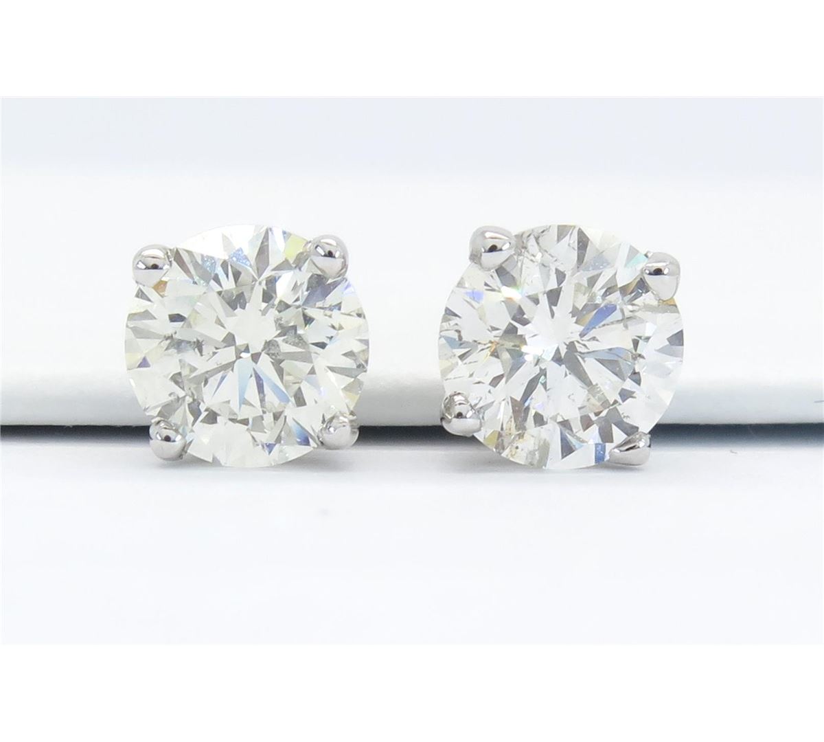 Two tested 14K white gold certified diamond stud earrings. Containing: 2 GIA Certified Round Brilliant Cut Diamonds, Size: 1.05CT and 1.06CT, Clarity: I1, Color: J-K. Total diamond weight: 2.11CTW. Weight of earrings: 1.82 grams. GIA Appraised.