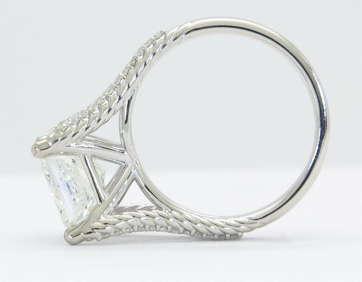 One tested 14K white gold diamond ring. Containing: One GIA Certified Princess Cut Diamond, Size: 3.00CT, Clarity: SI2, Color: I. 48 Round Brilliant Cut Diamonds. Approximate total diamond weight: 3.25CTW. All diamonds are graded in the mounting unless otherwise stated. Weight of ring: 5.6 grams, Size: 6.75. GIA Appraised.