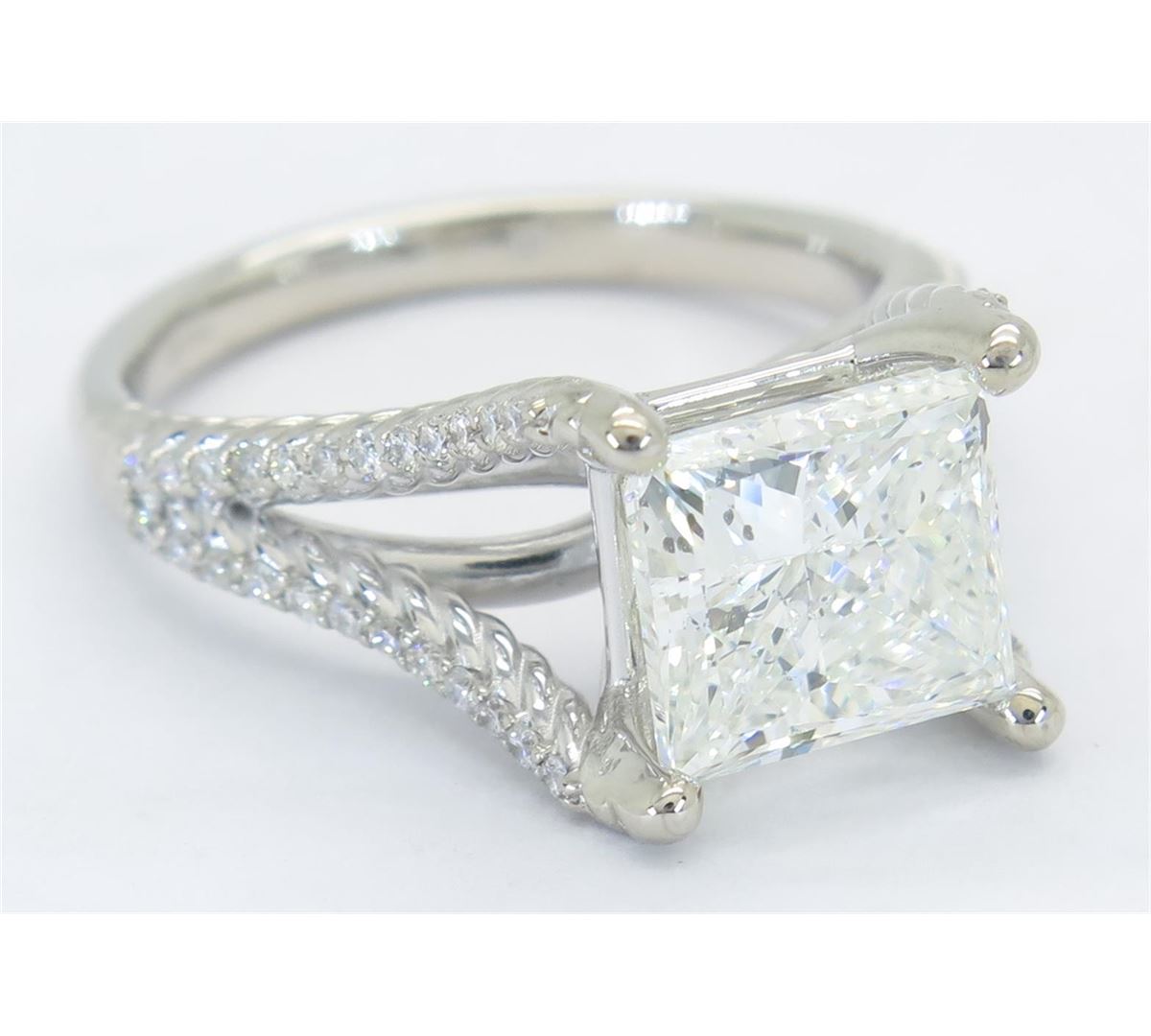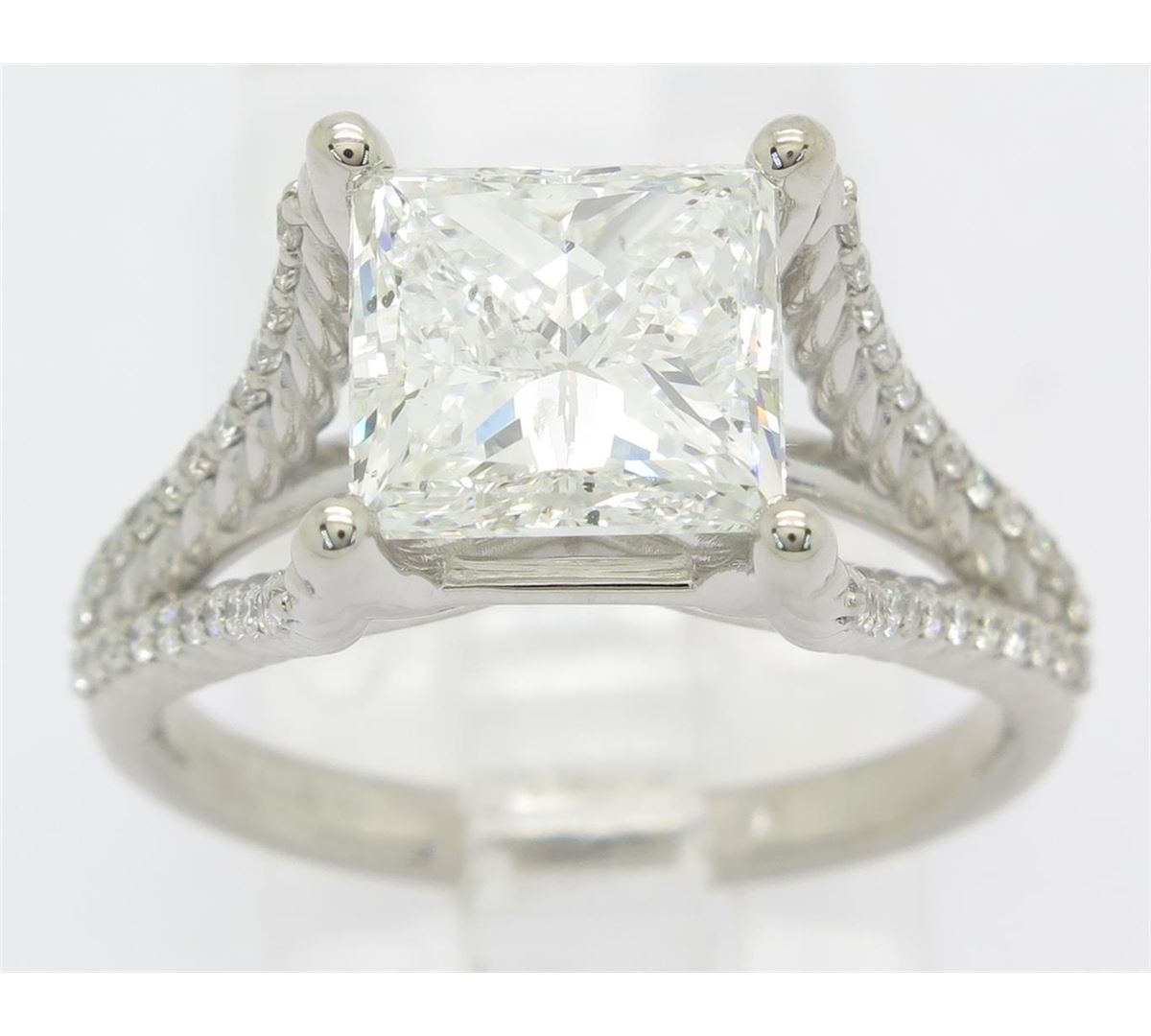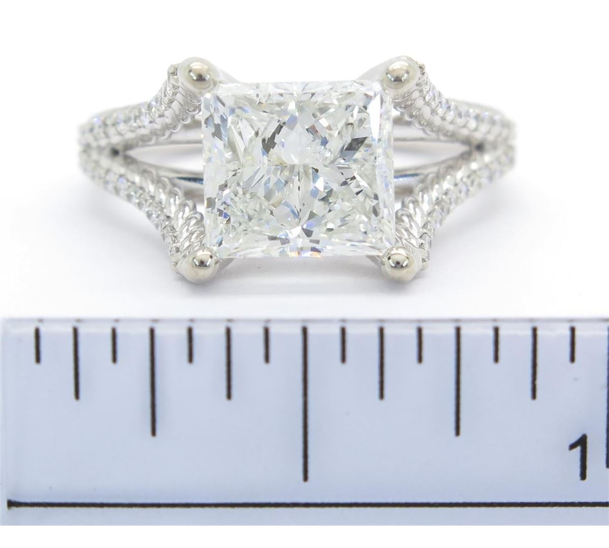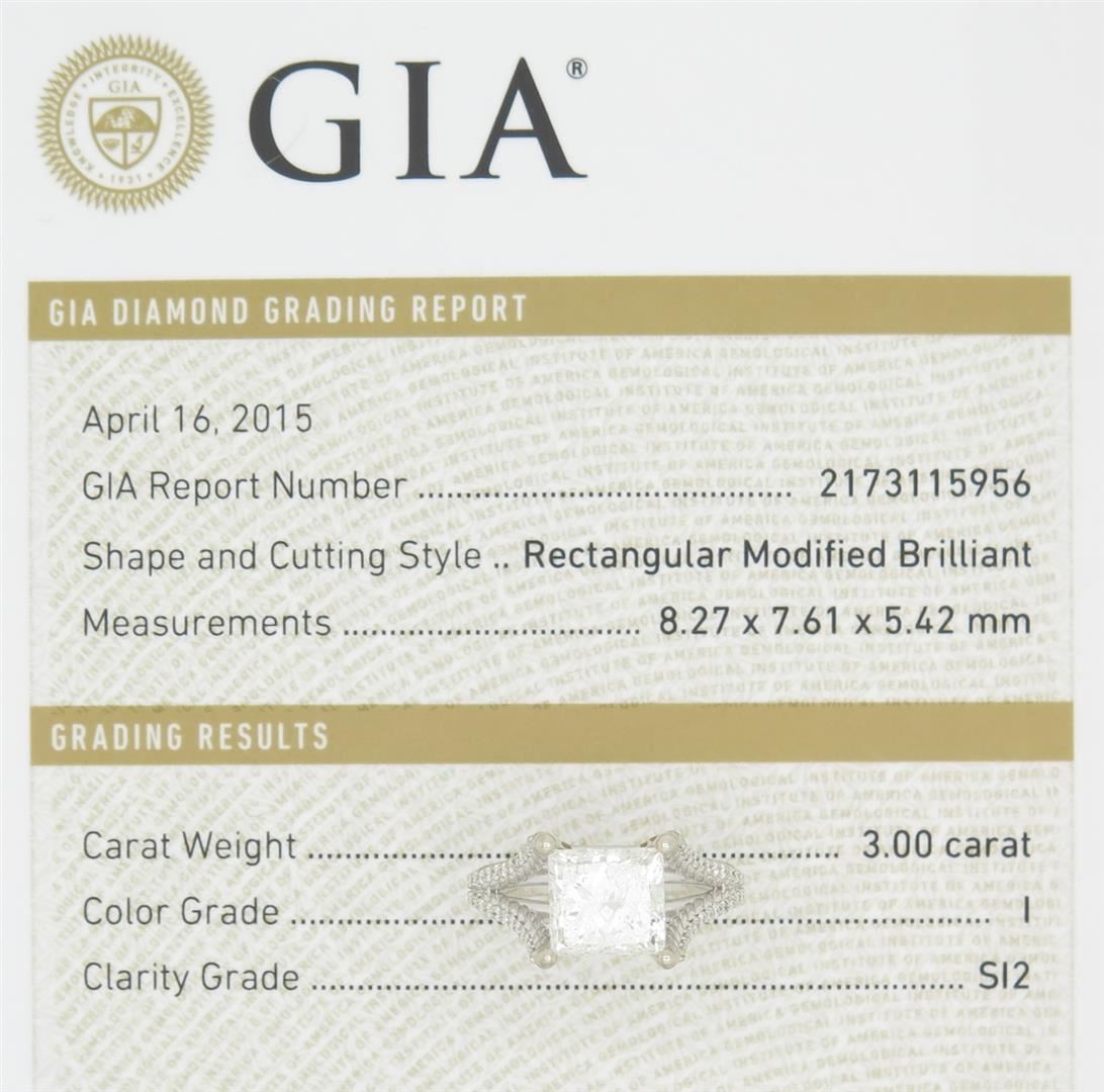 One tested 14K white gold diamond ring. Containing: One GIA Certified Princess Cut Diamond, Size: 3.00CT, Clarity: SI2, Color: I. 48 Round Brilliant Cut Diamonds. Approximate total diamond weight: 3.25CTW. All diamonds are graded in the mounting unless otherwise stated. Weight of ring: 5.6 grams, Size: 6.75. GIA Appraised.