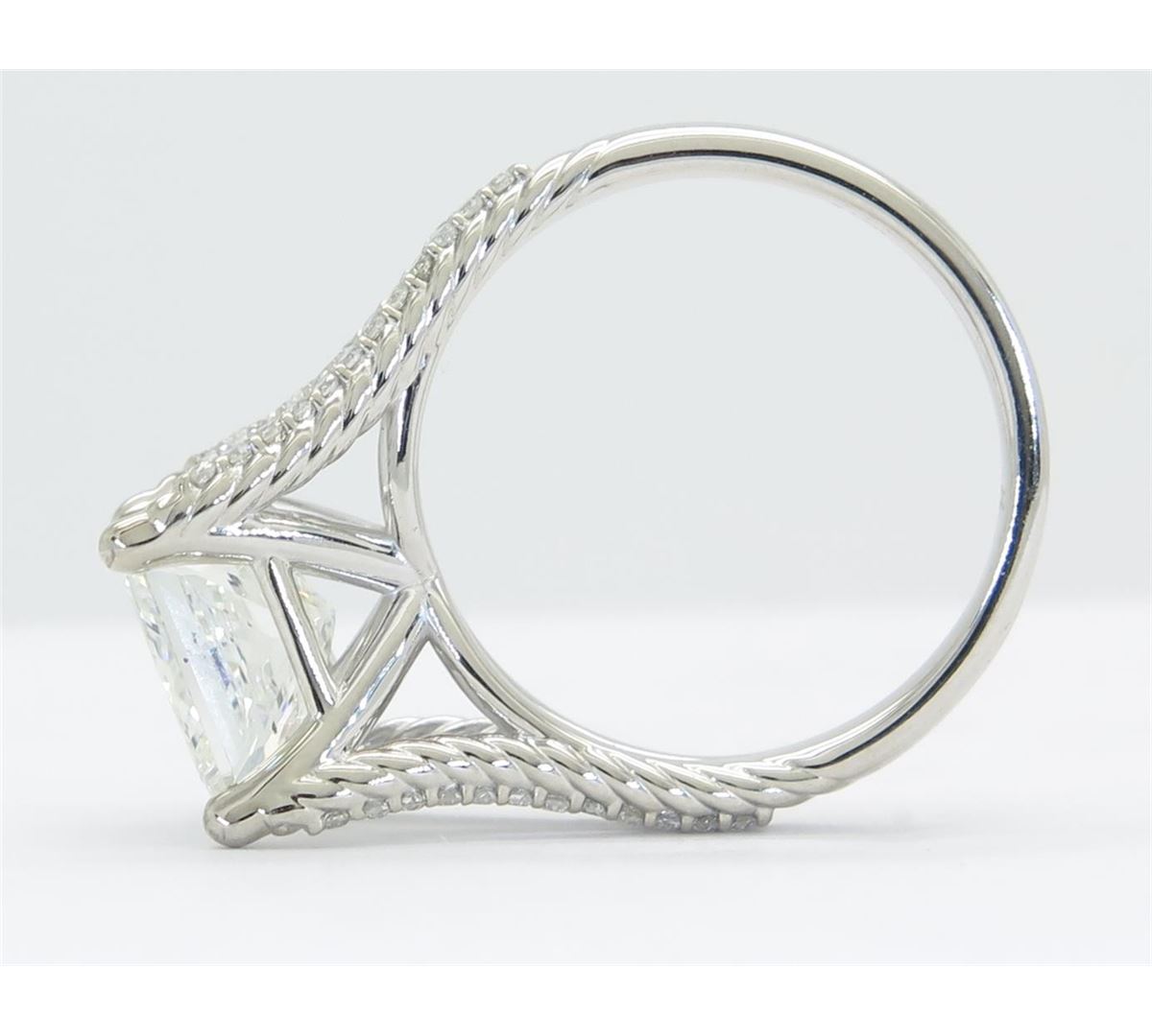 One tested 14K white gold diamond ring. Containing: One GIA Certified Princess Cut Diamond, Size: 3.00CT, Clarity: SI2, Color: I. 48 Round Brilliant Cut Diamonds. Approximate total diamond weight: 3.25CTW. All diamonds are graded in the mounting unless otherwise stated. Weight of ring: 5.6 grams, Size: 6.75. GIA Appraised.