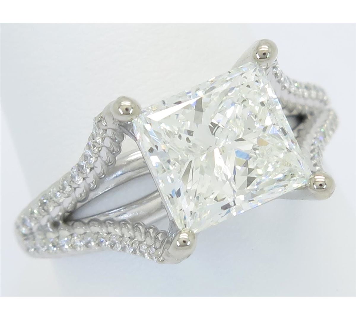 One tested 14K white gold diamond ring. Containing: One GIA Certified Princess Cut Diamond, Size: 3.00CT, Clarity: SI2, Color: I. 48 Round Brilliant Cut Diamonds. Approximate total diamond weight: 3.25CTW. All diamonds are graded in the mounting unless otherwise stated. Weight of ring: 5.6 grams, Size: 6.75. GIA Appraised.